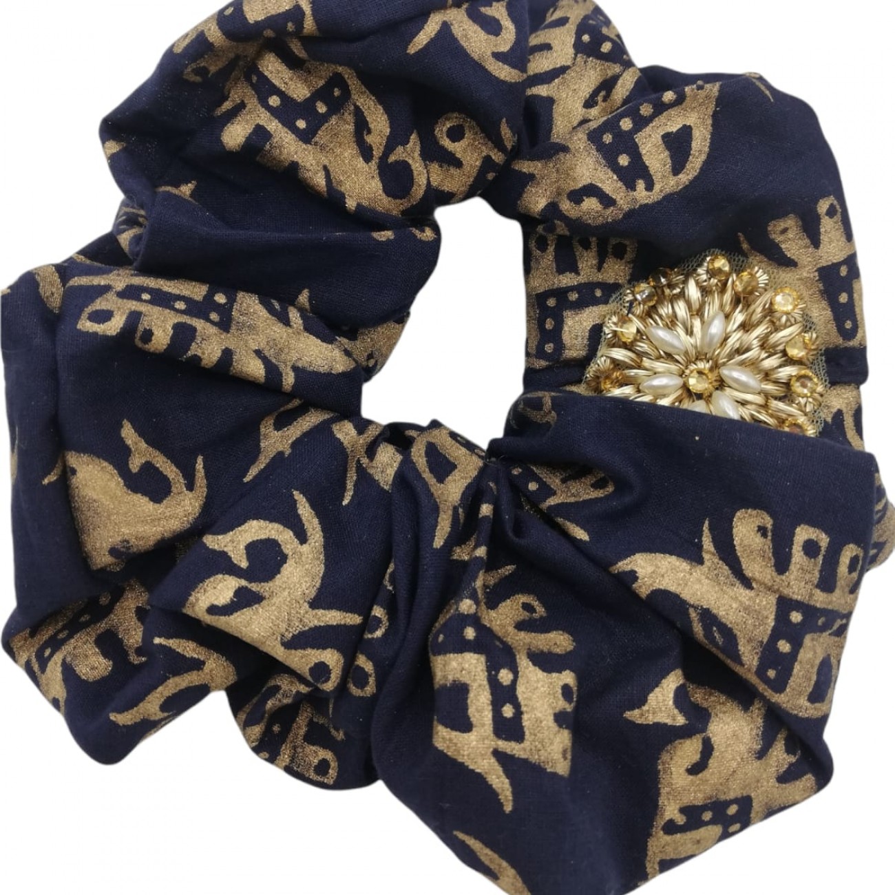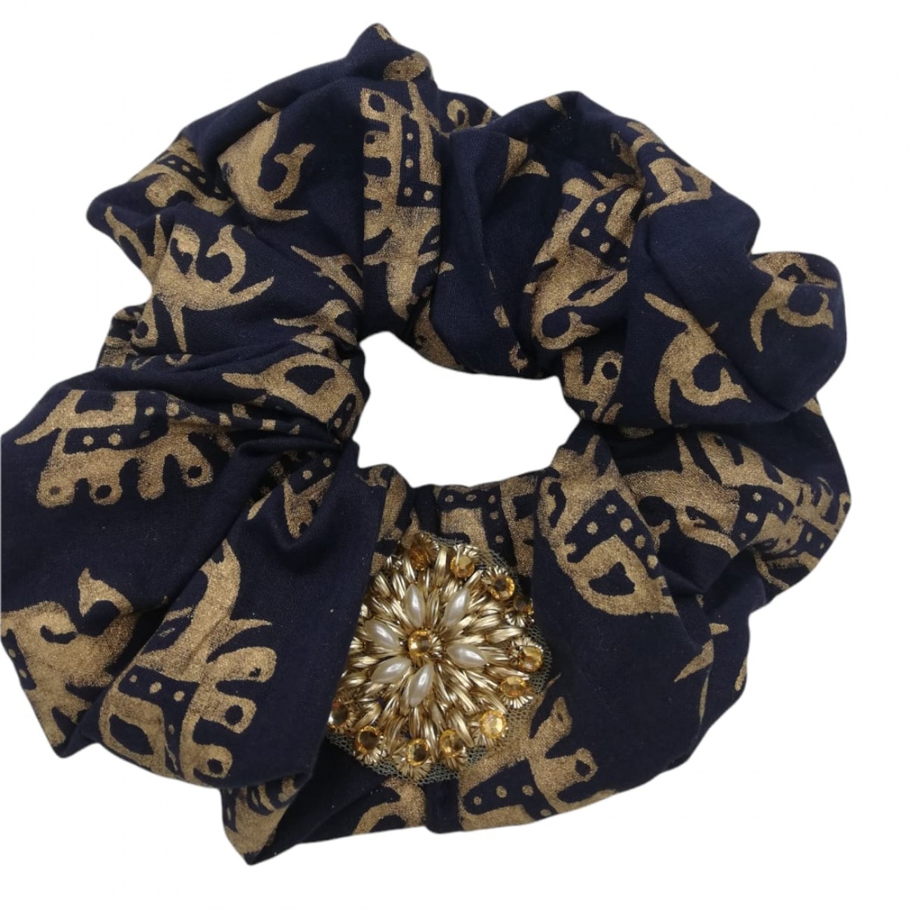 elastico scrunchie in cotone indiano stampato a mano, con base blu ed elefantini oro