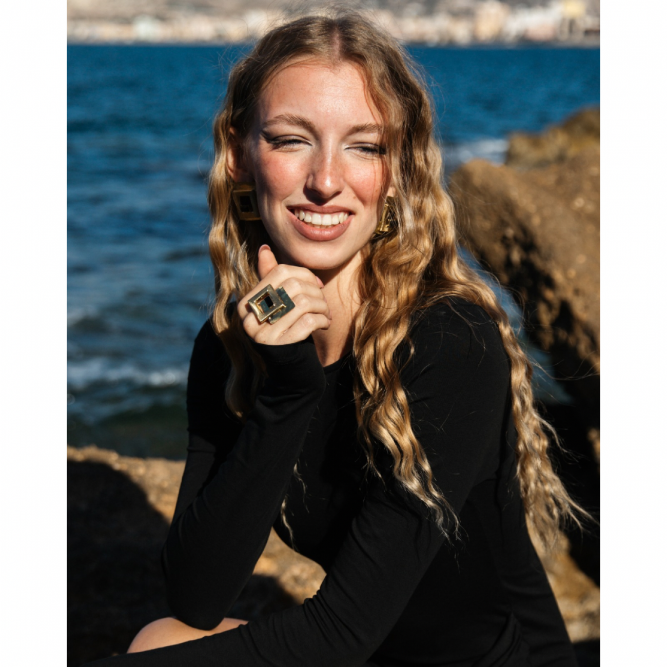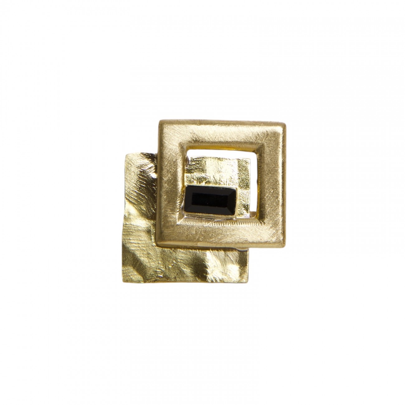 Anello in ottone con motivo doppio quadrato sovrapposto e pietra sintetica taglio rettangolare centrale.