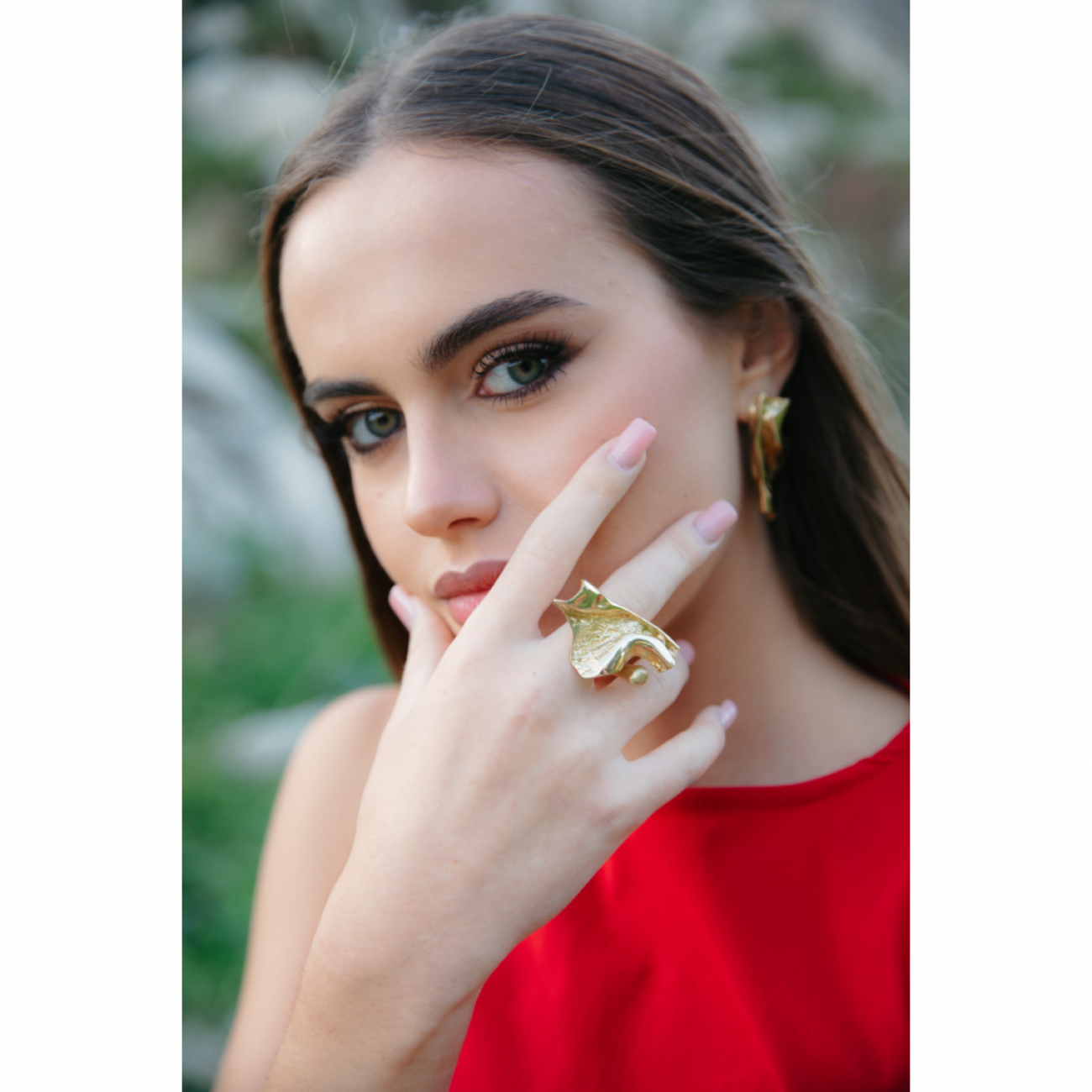 Anello in ottone con motivo asimmetrico.