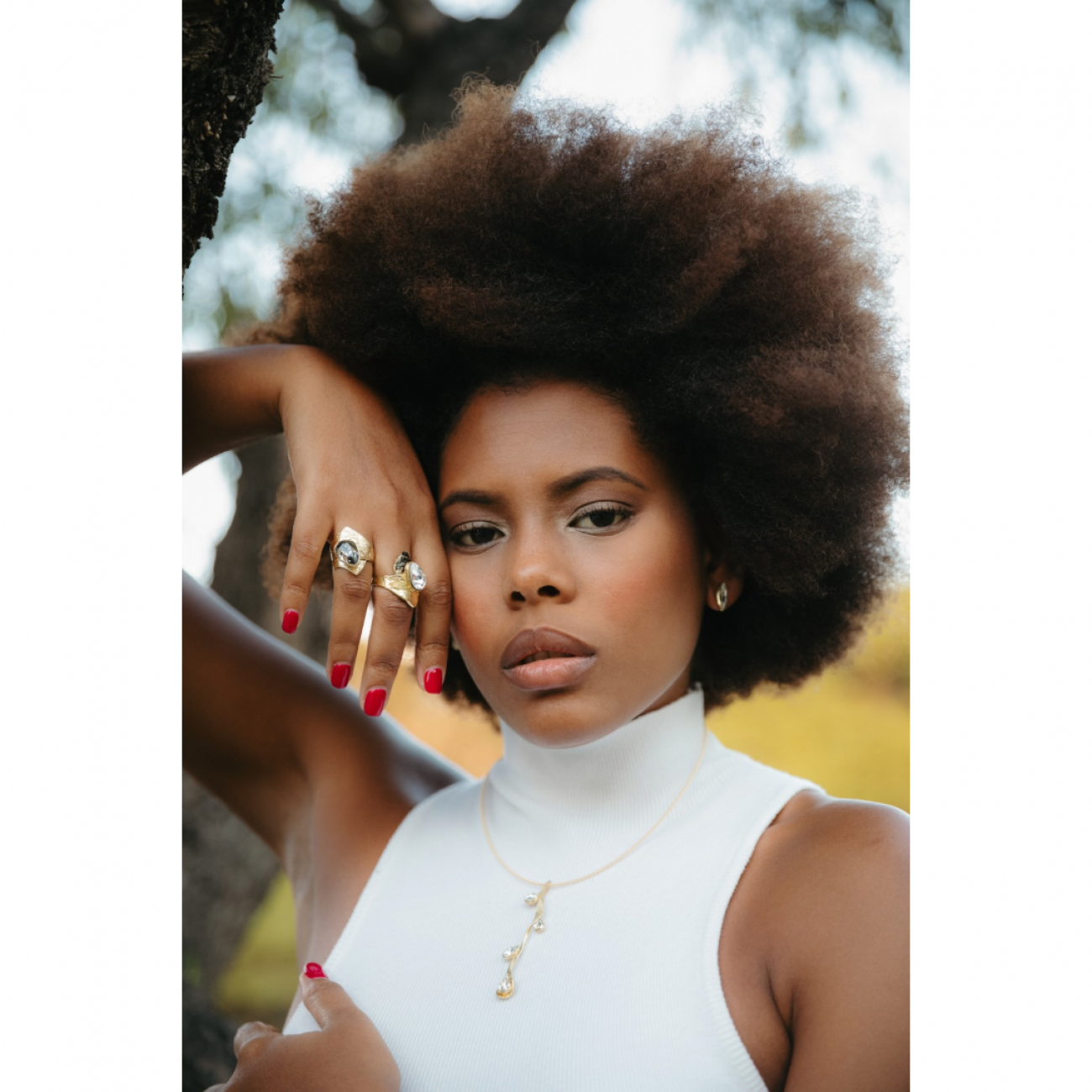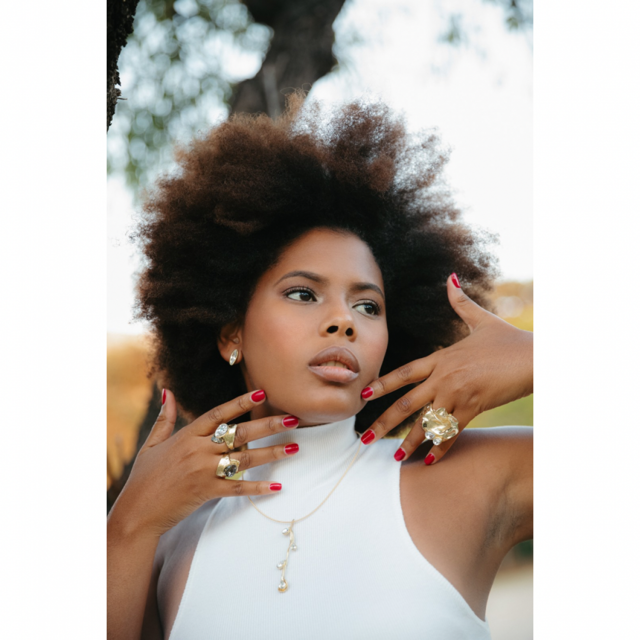 Anello in ottone con motivo a goccia e pietra sintetica.
