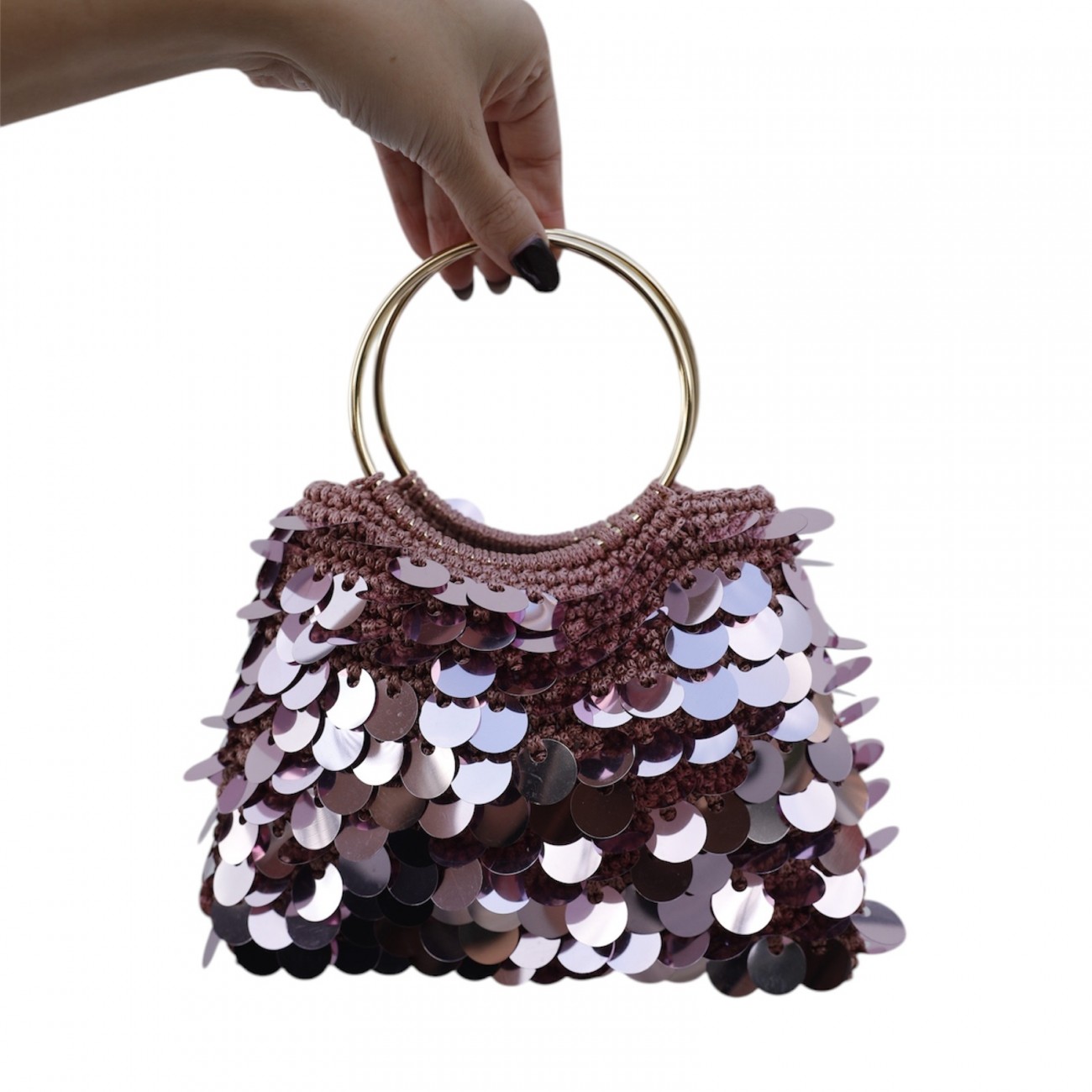 Borsa fatta a mano all'uncinetto in cordino e paillettes con manici ad anelli.