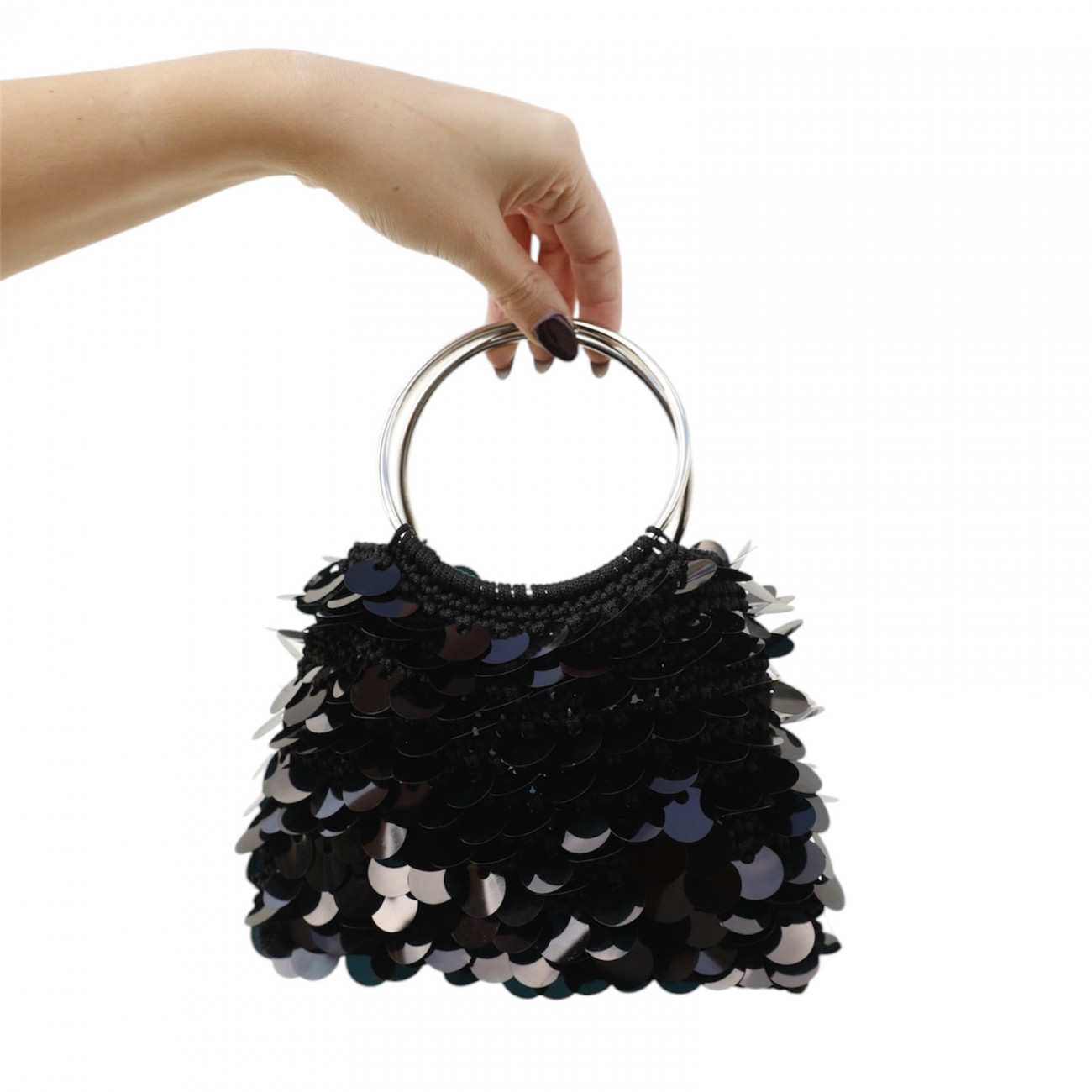 Borsa fatta a mano all'uncinetto in cordino e paillettes con manici ad anelli.