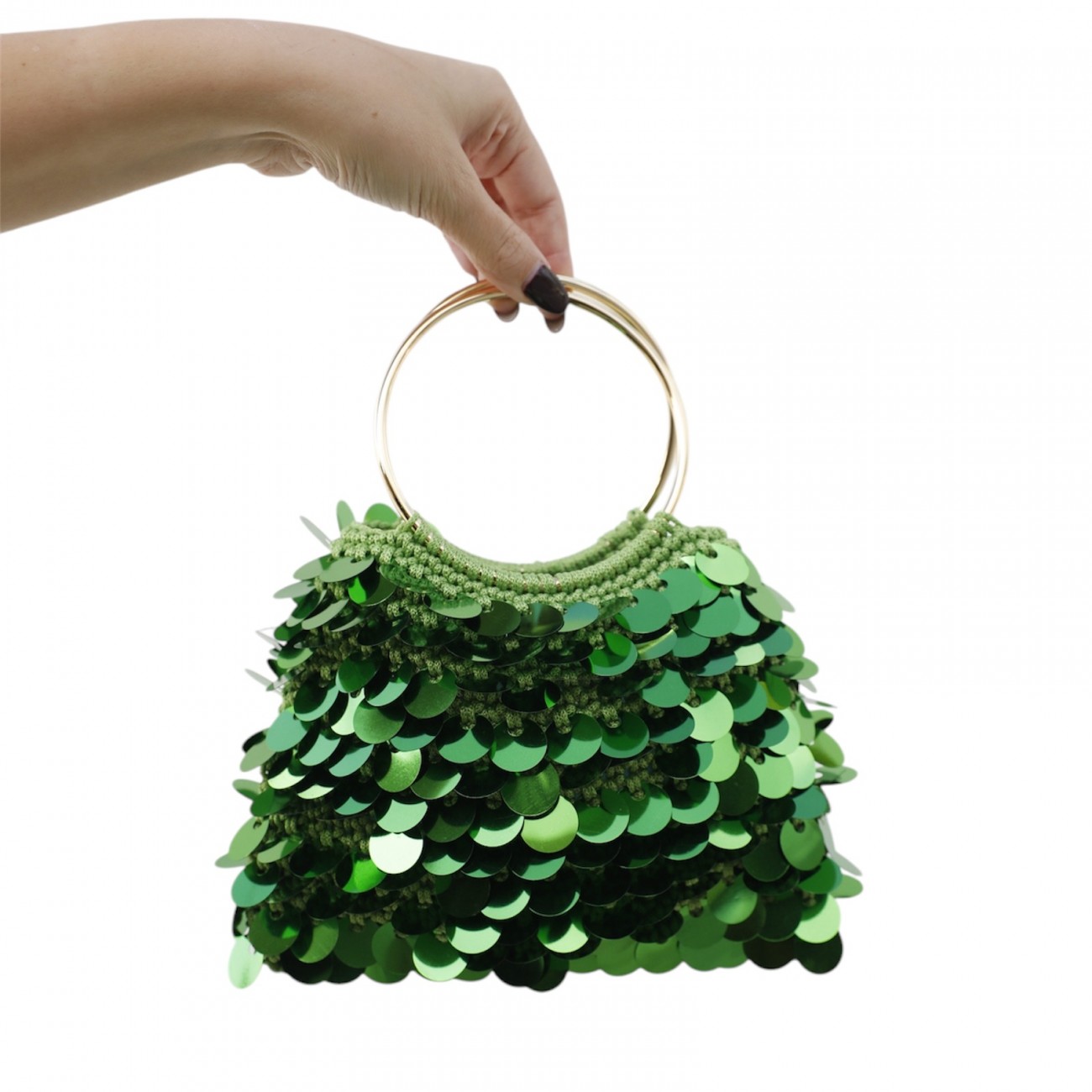 Borsa fatta a mano all'uncinetto in cordino e paillettes con manici ad anelli.