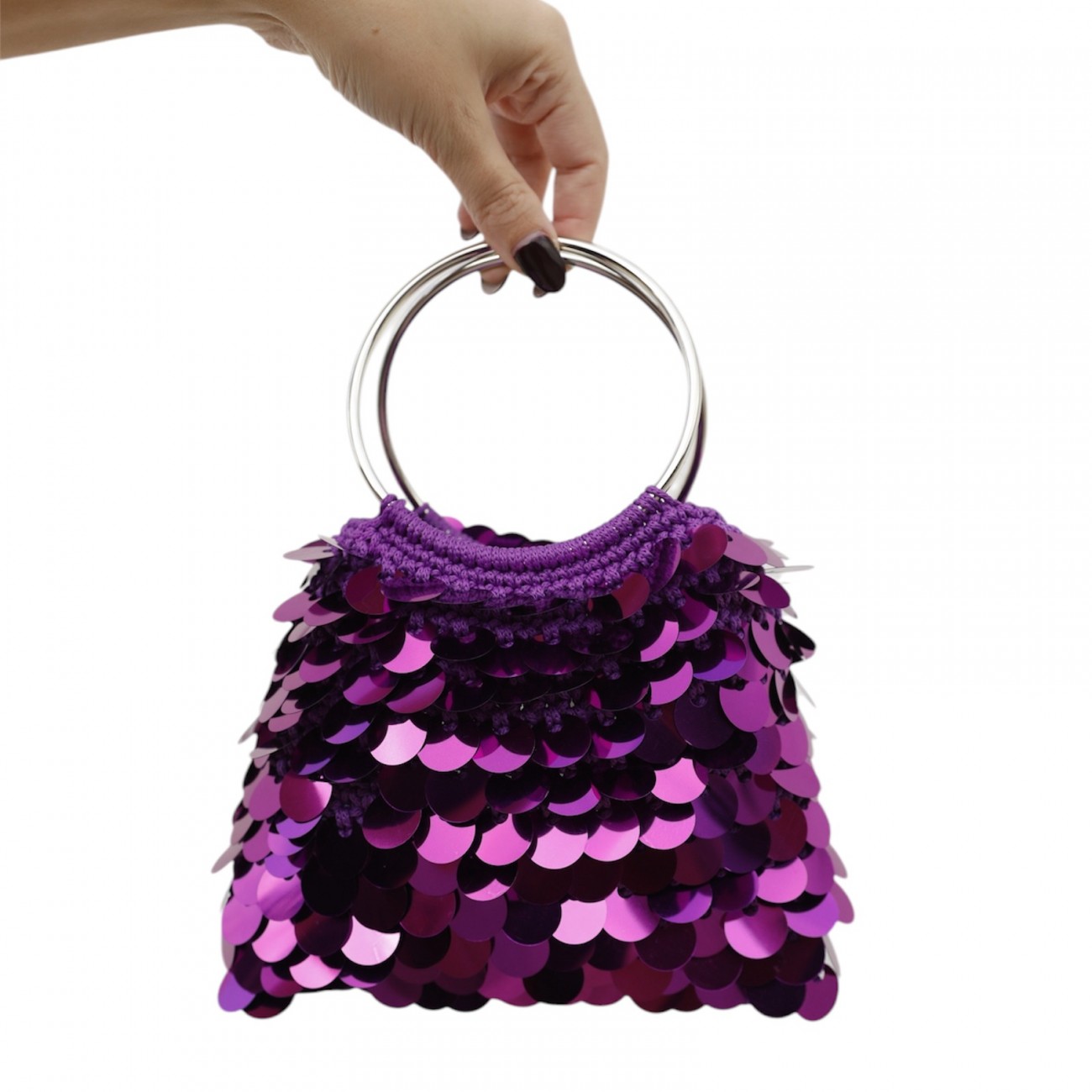 Borsa fatta a mano all'uncinetto in cordino e paillettes con manici ad anelli.