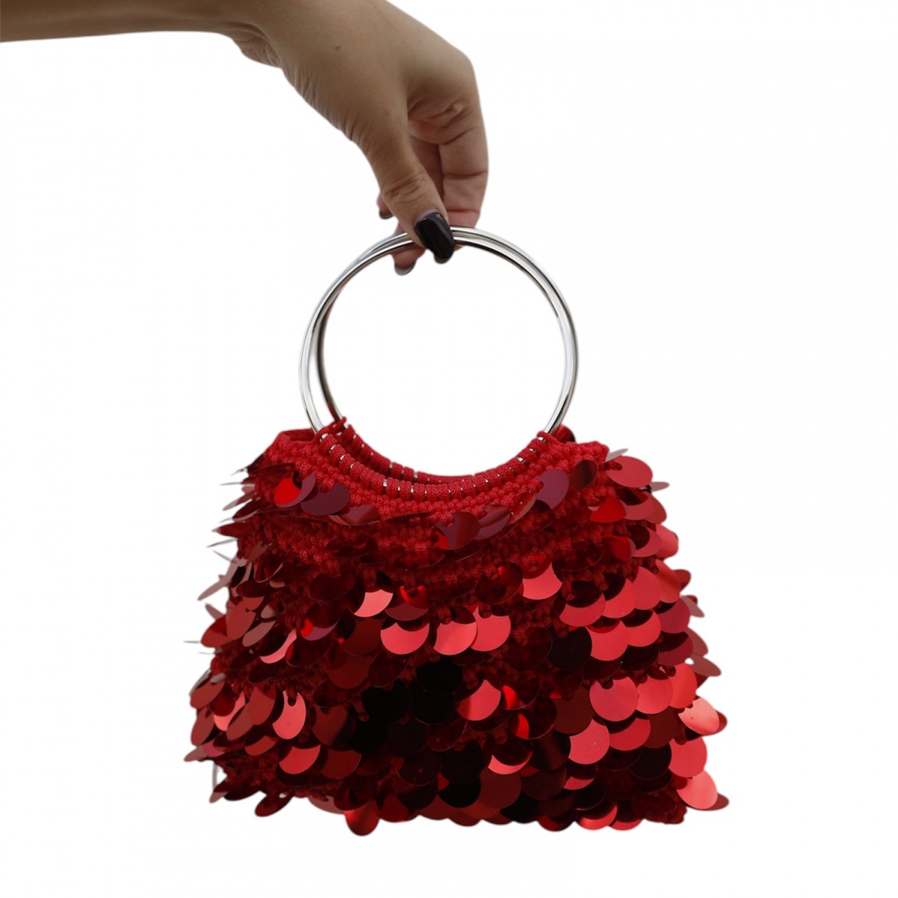 Borsa fatta a mano all'uncinetto in cordino e paillettes con manici ad anelli.