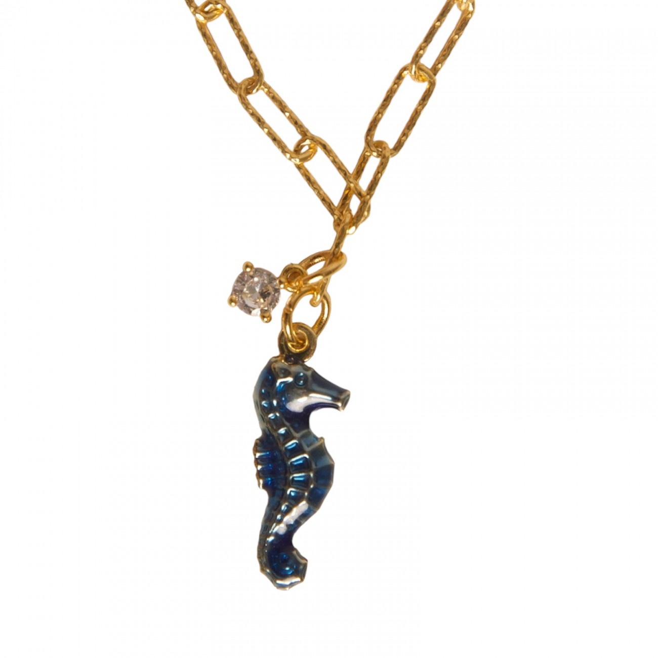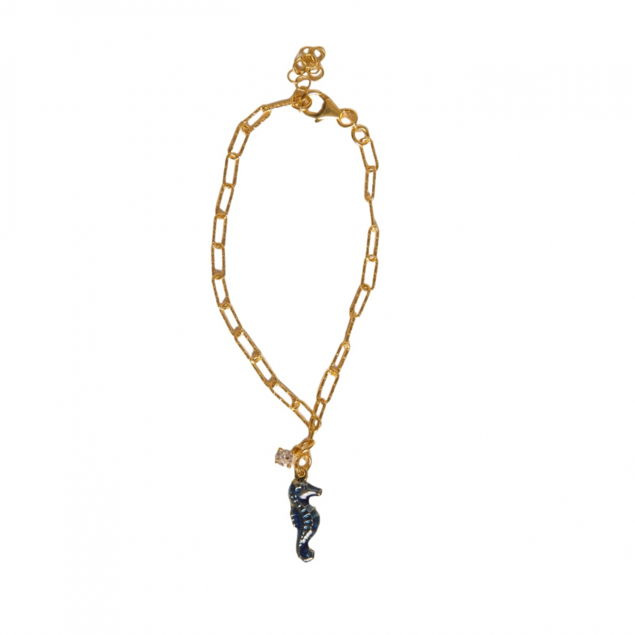 Bracciale in argento dorato con pendente a forma di cavalluccio marino smaltato e strass.