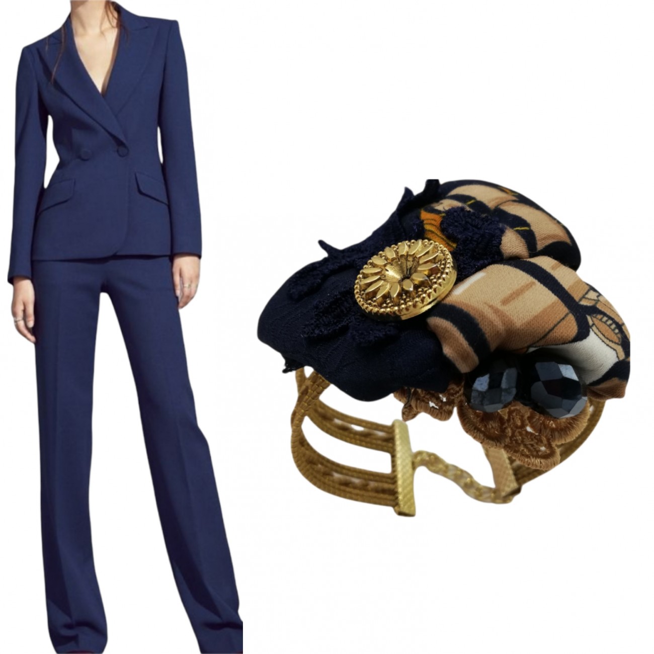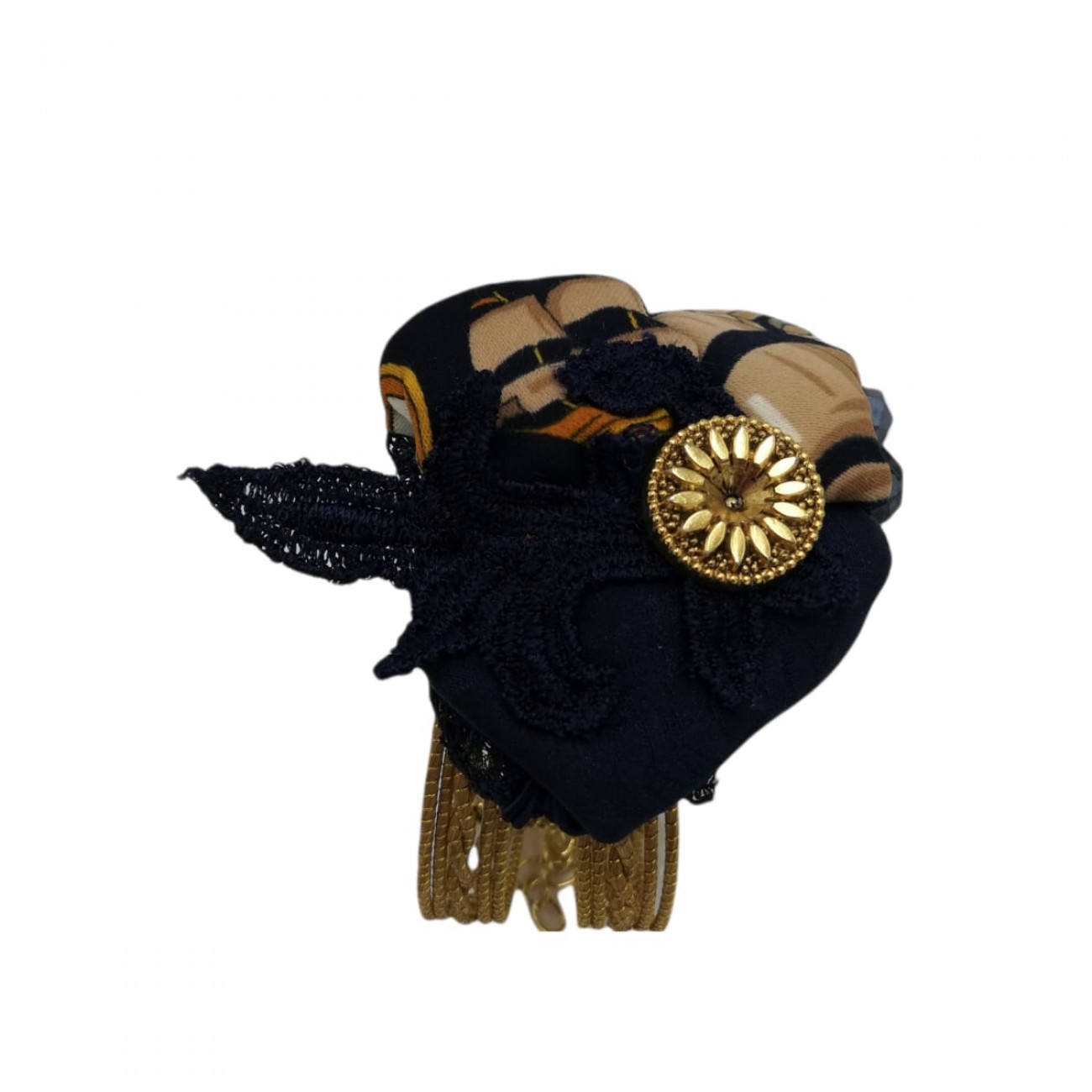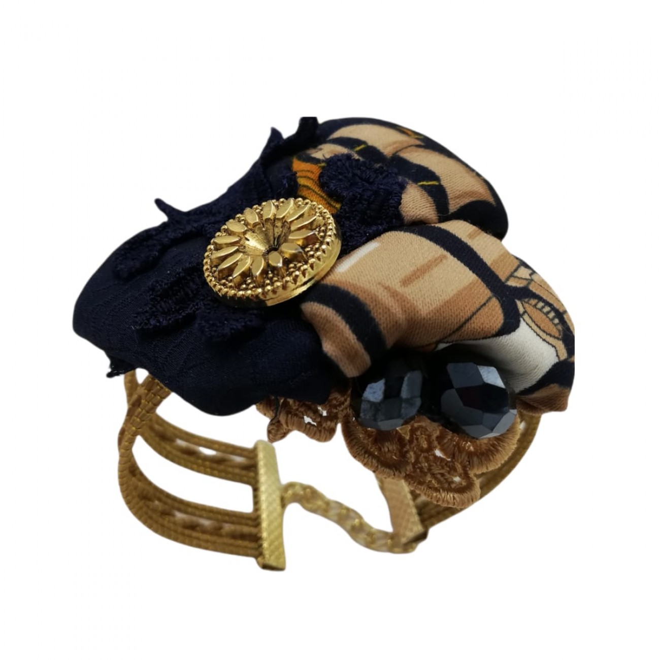 Bracciale su base oro vegetale ed applicazione in stoffa. Per la donna chiccosa, una chicca sull'abito semplice.