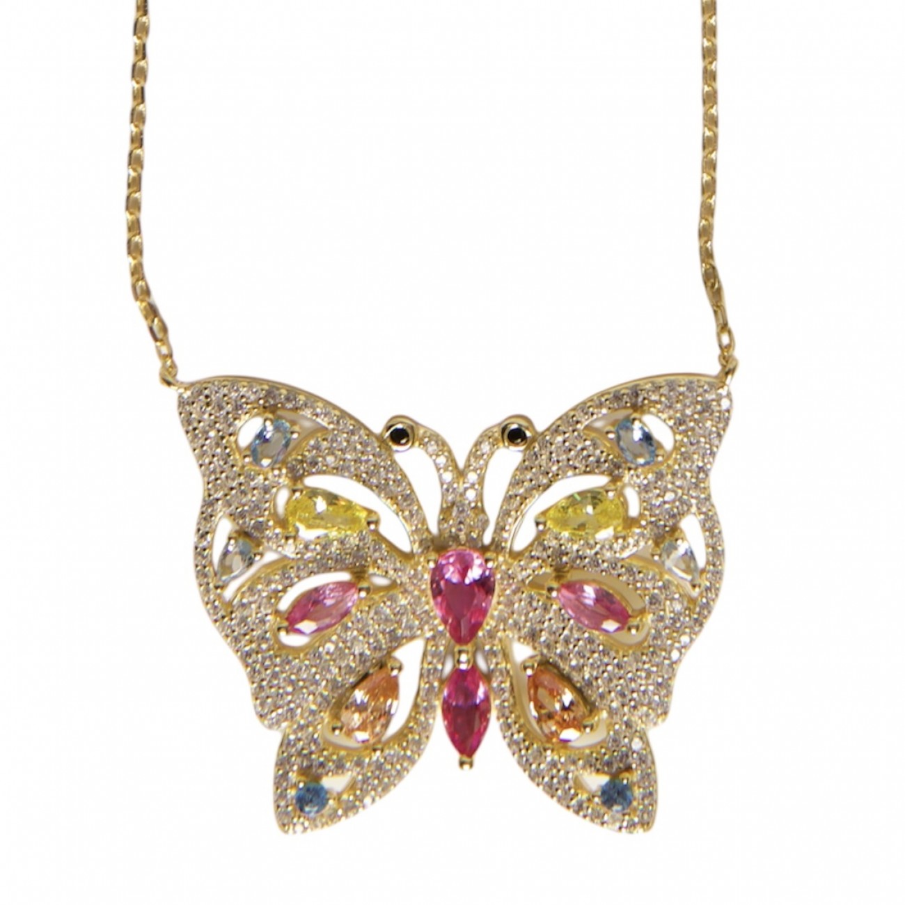 Collana in argento dorato con ciondolo a forma di farfalla con zirconi e pietre