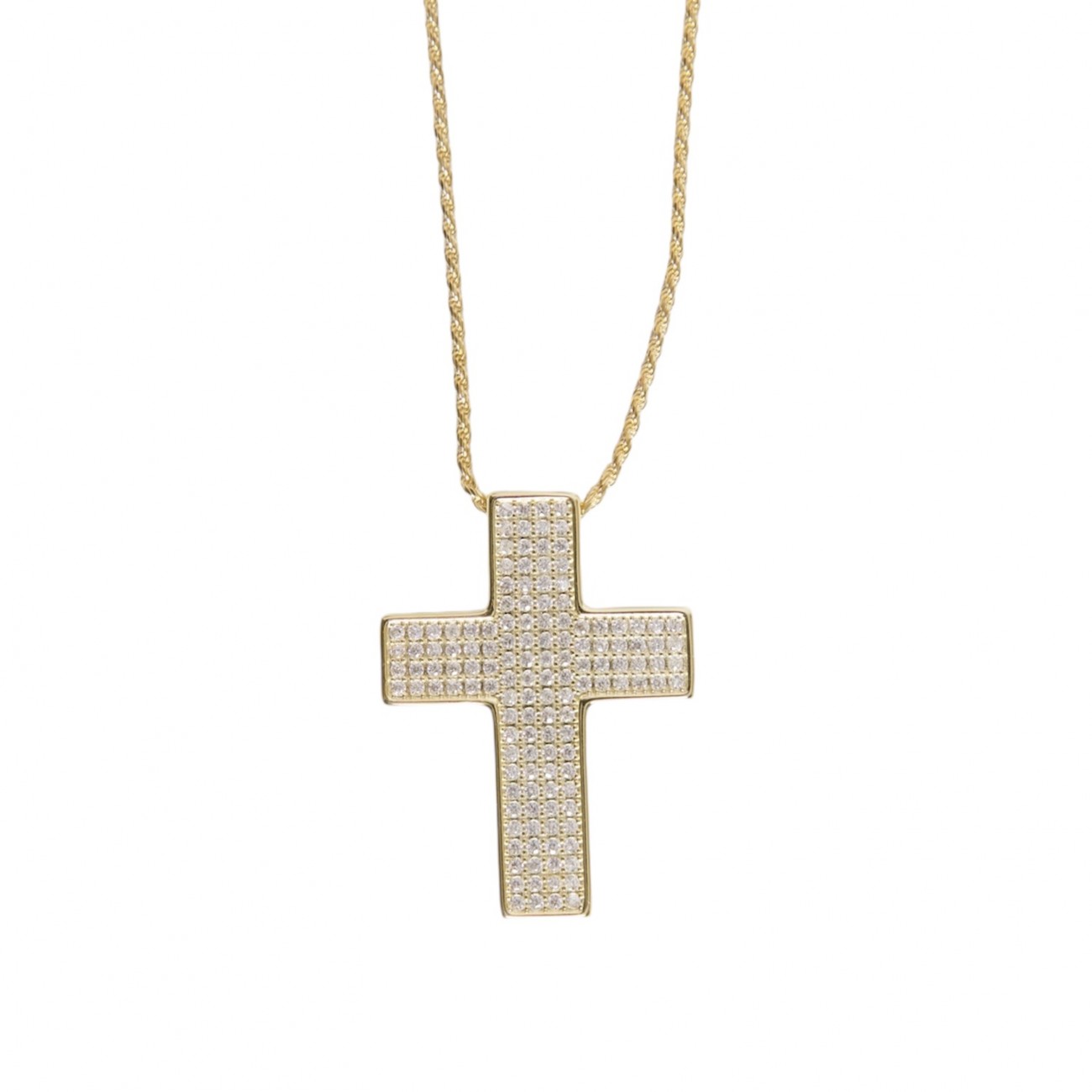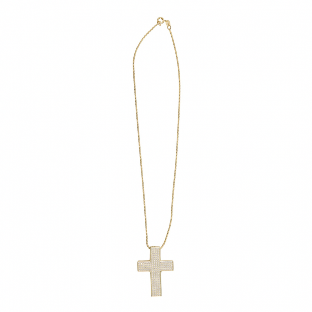 Collana in argento dorato con pendente a forma di croce e zirconi.