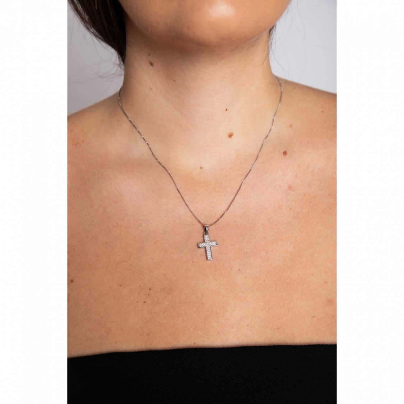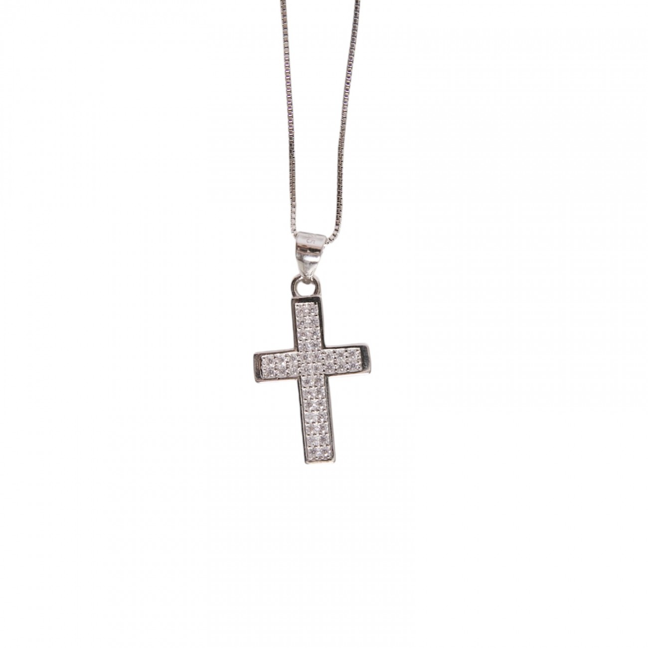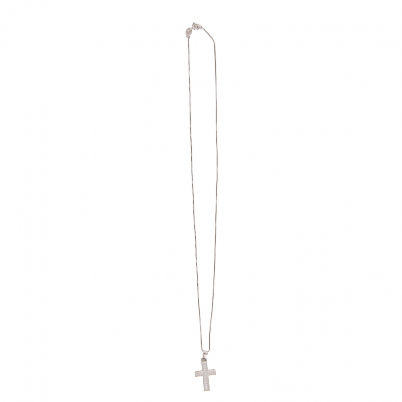 Collana in argento con pendente a forma di croce e zirconi.