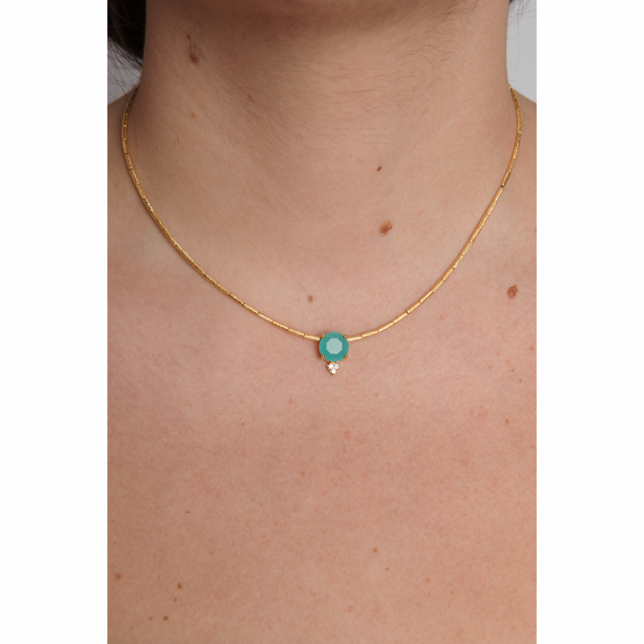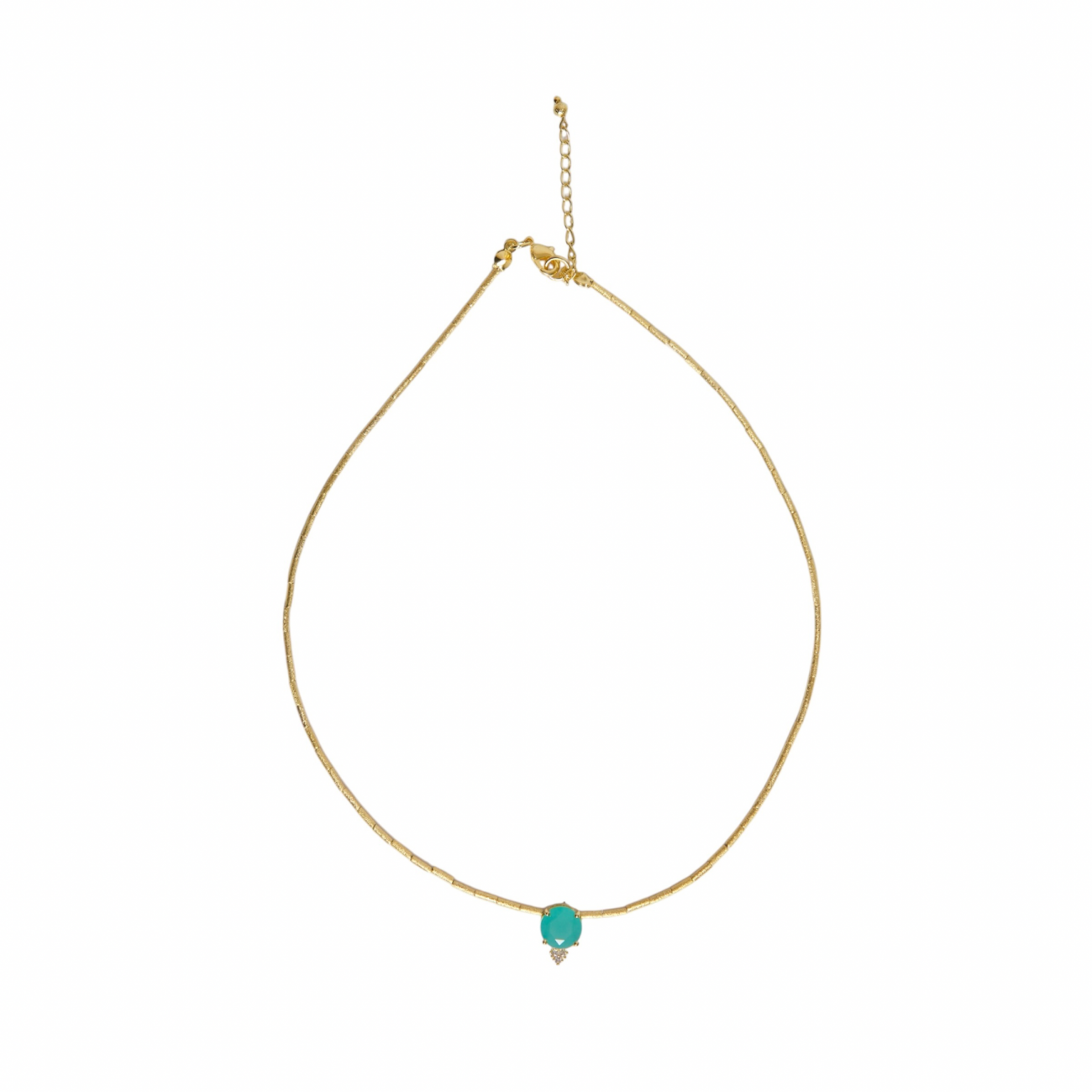 Collana in bronzo satinato placcato oro con pendente in pietra sintetica e strass.