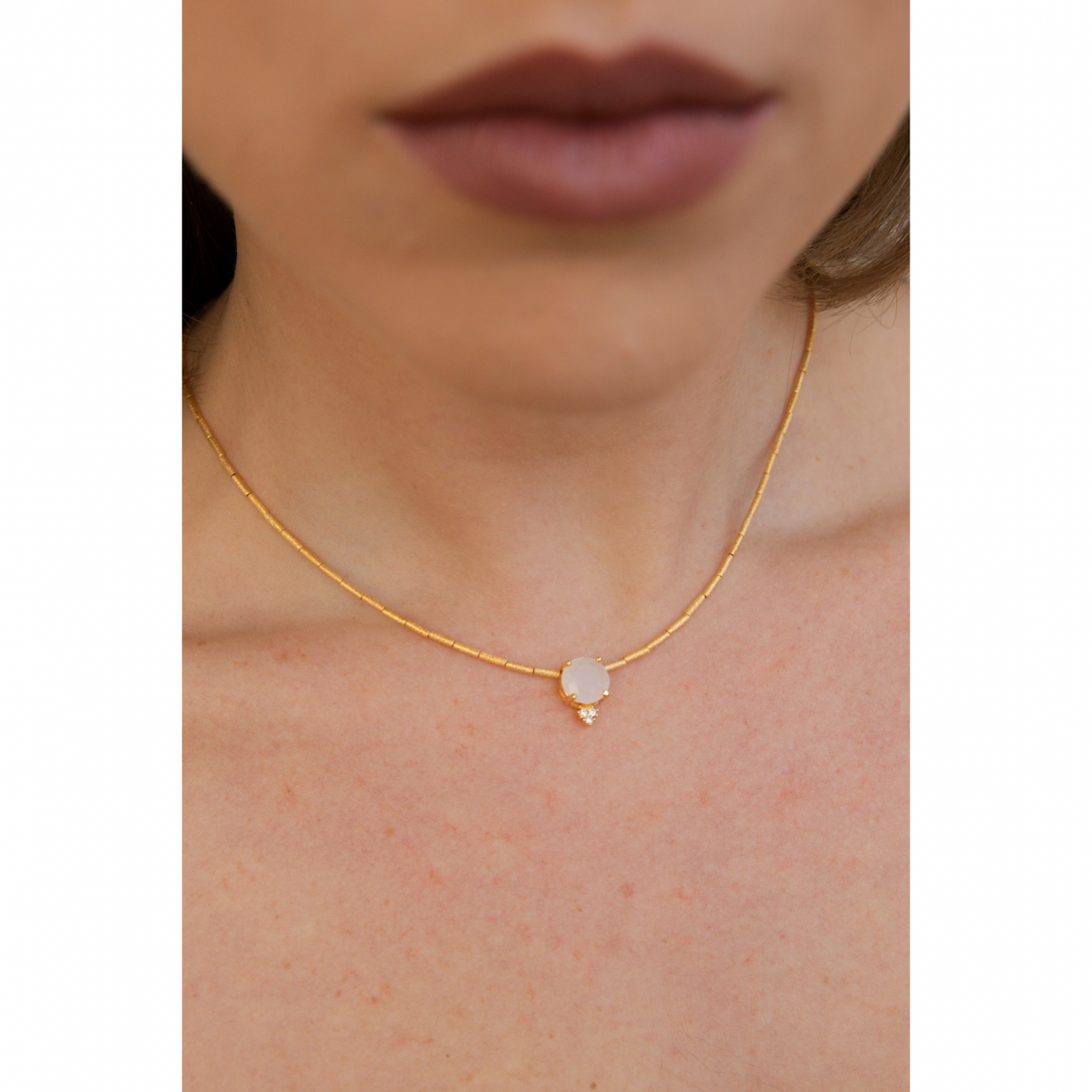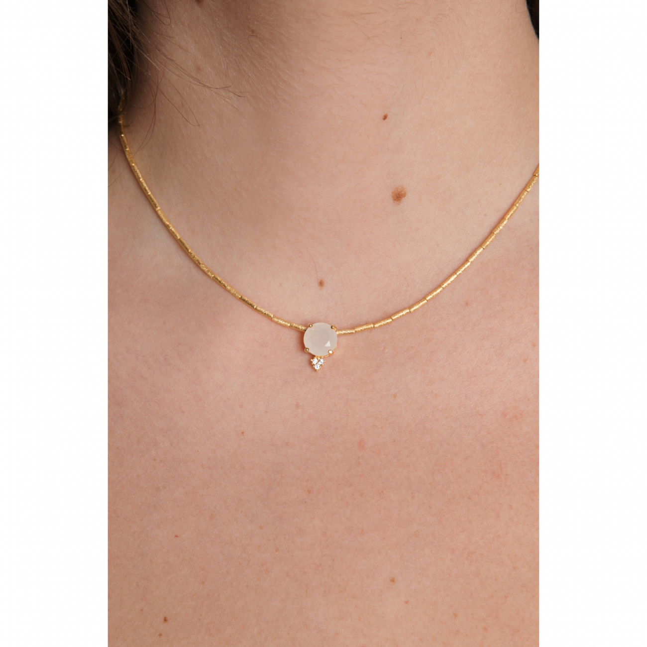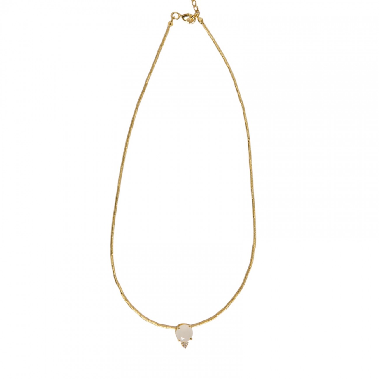 Collana in bronzo satinato placcato oro con pendente in pietra sintetica e strass.