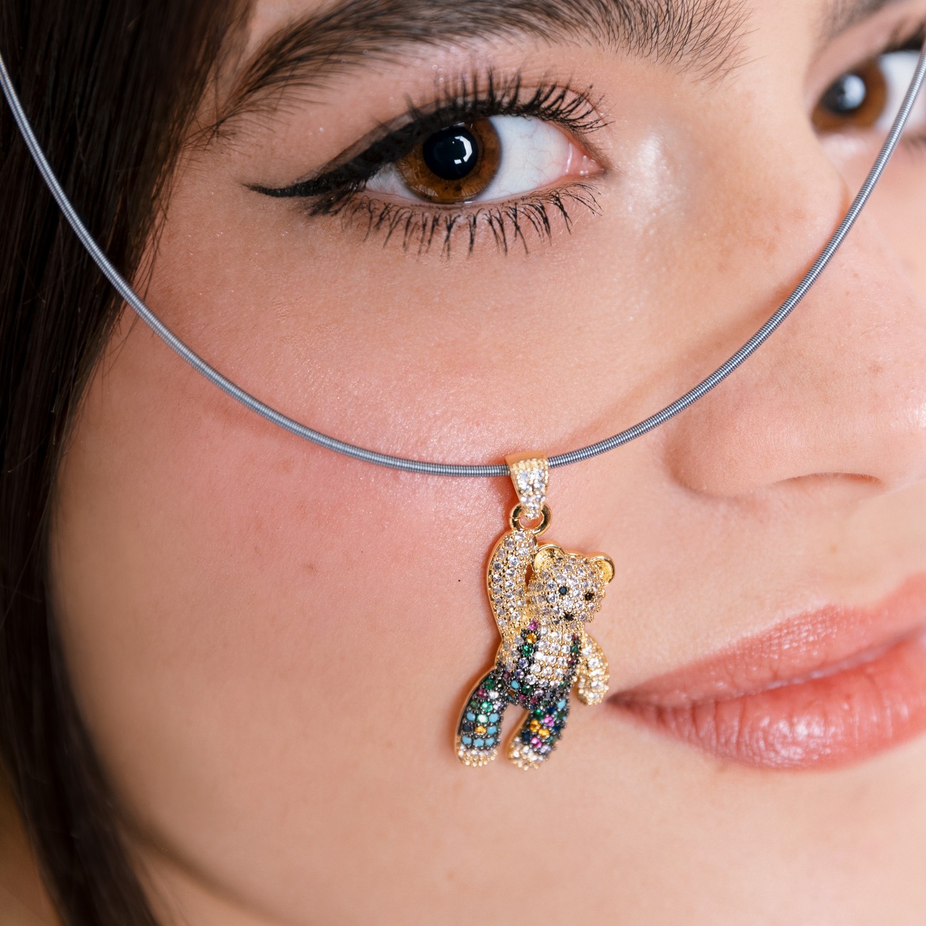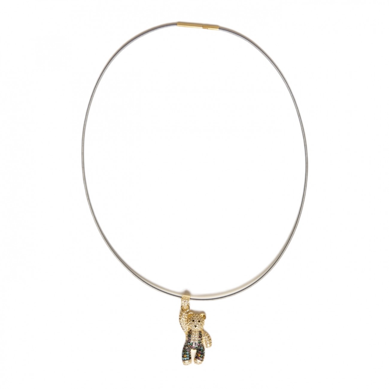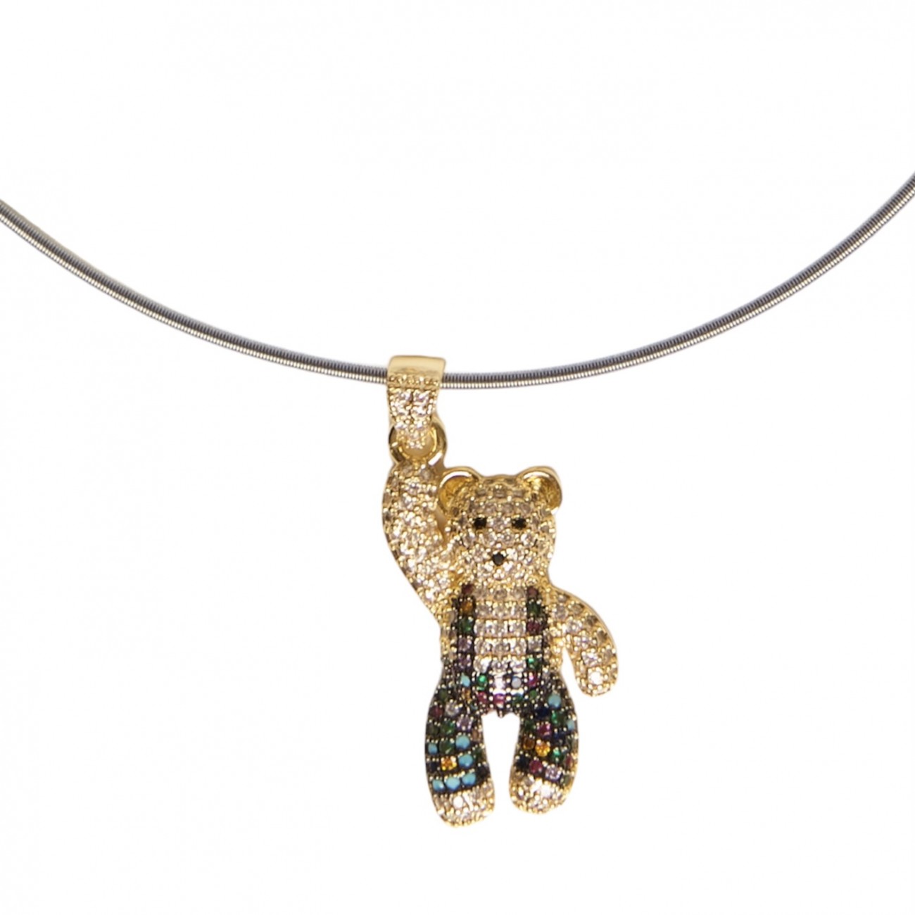 Collana semirigida in acciaio con pendente a forma di orsacchiotto con strass colorati.