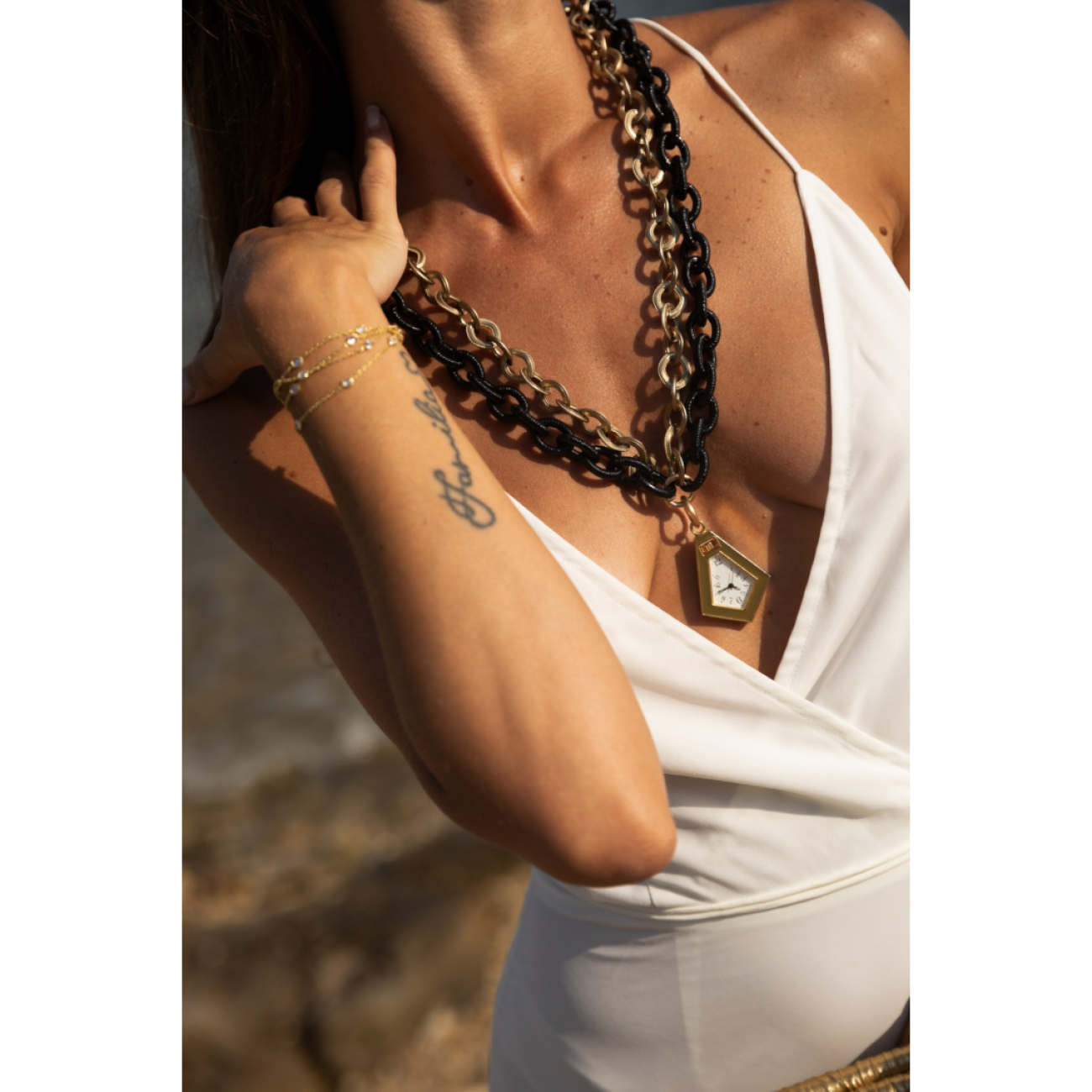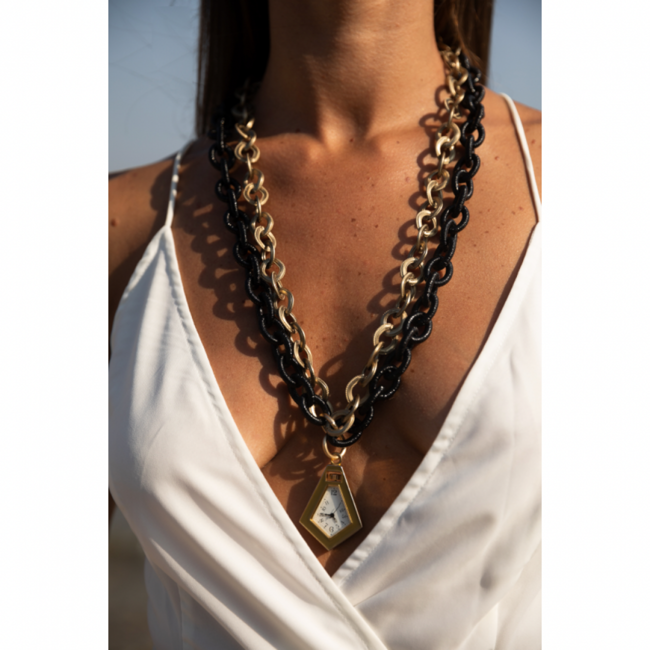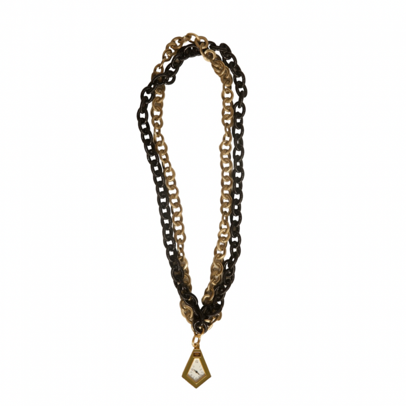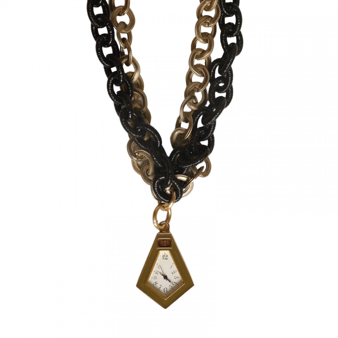 Collana doppia catena in resina con orologio vintage funzionante come pendente.