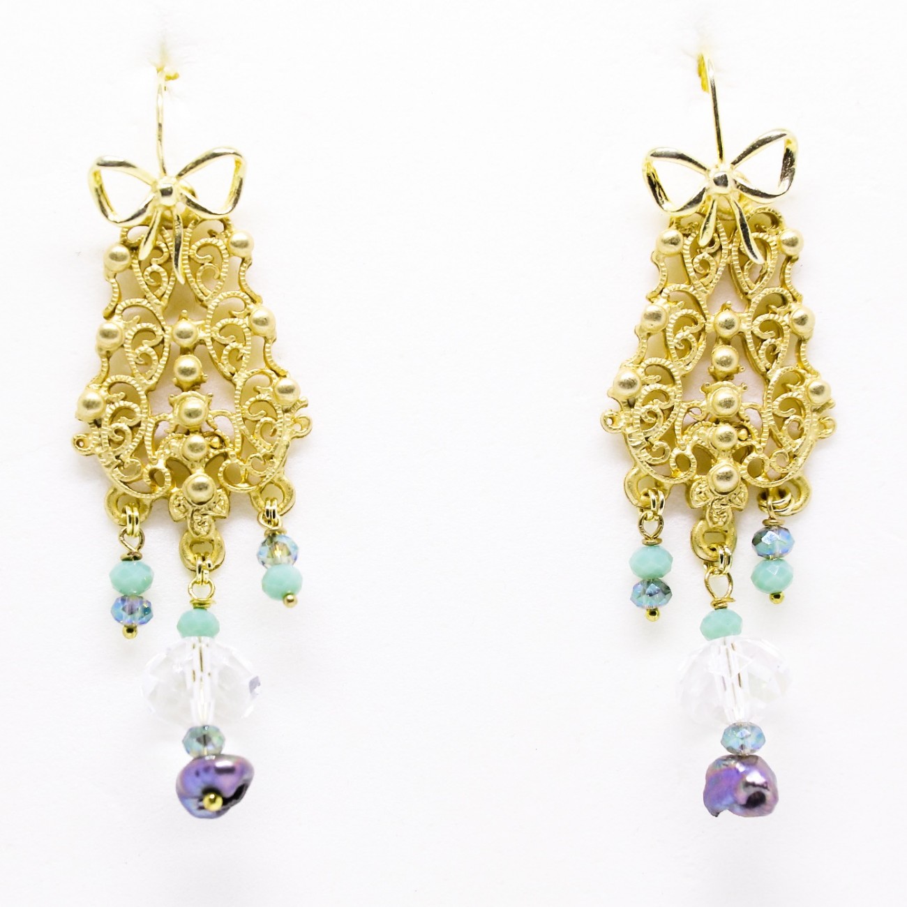 orecchini in fantasia zama, perle e perline con attacchi fiocco in argento placcato oro