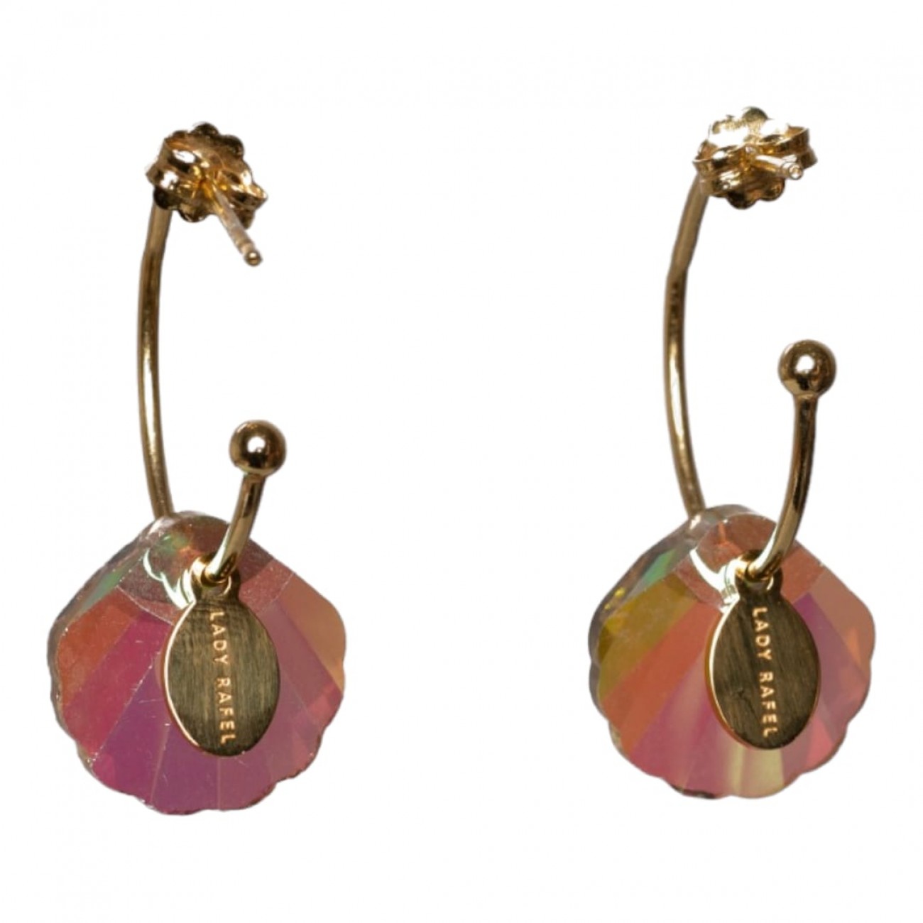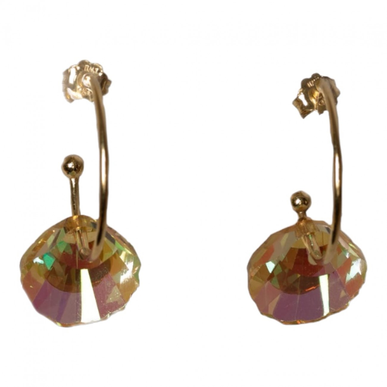 Orecchini a forma di cerchio in argento con pendente in vetro swarovski a forma di conchiglia.