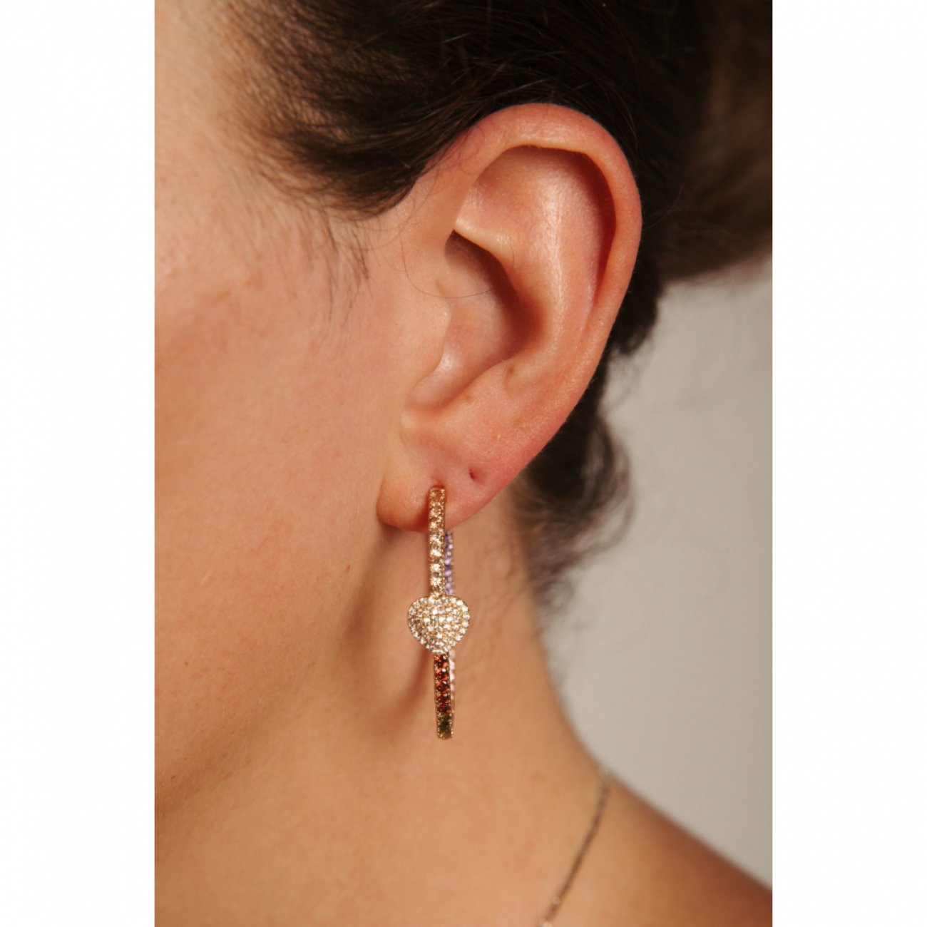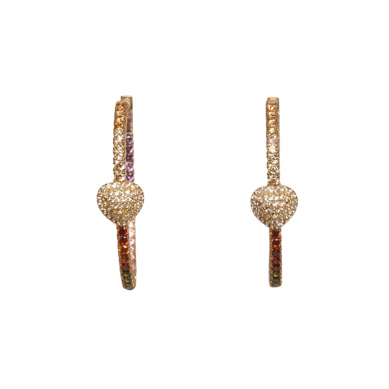 Orecchini in argento a forma di cerchio con zirconi colorati e dettaglio a forma di cuoricino.