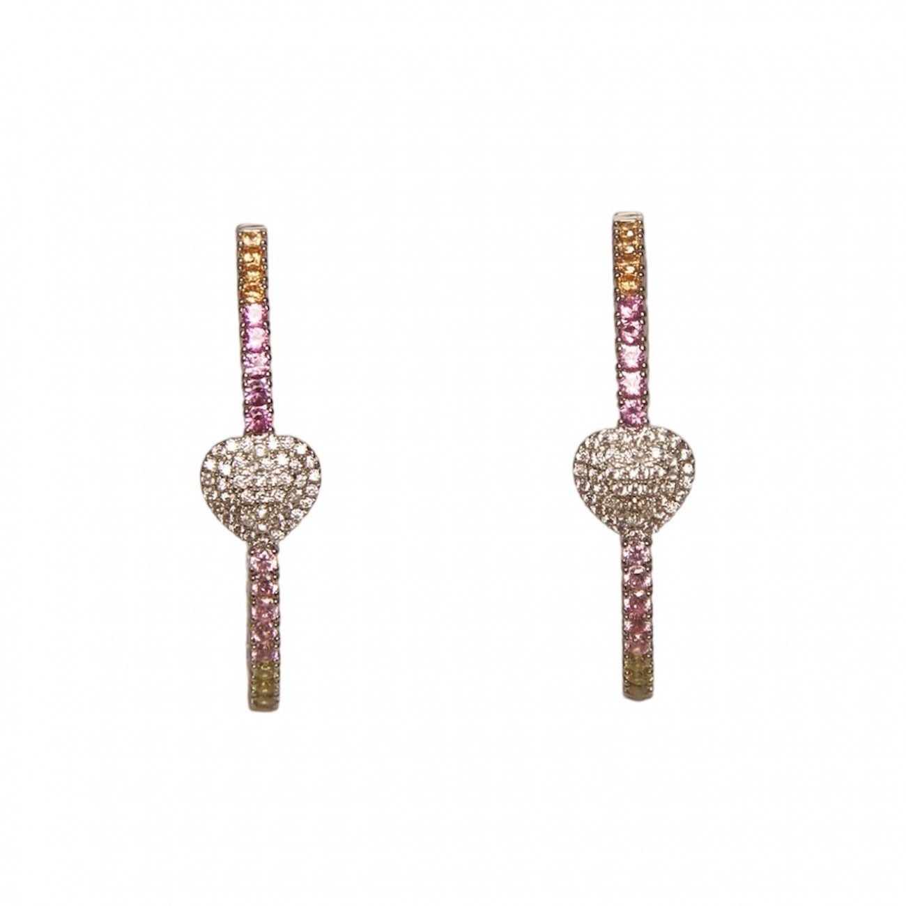 Orecchini in argento a forma di cerchio con zirconi colorati e dettaglio a forma di cuoricino.