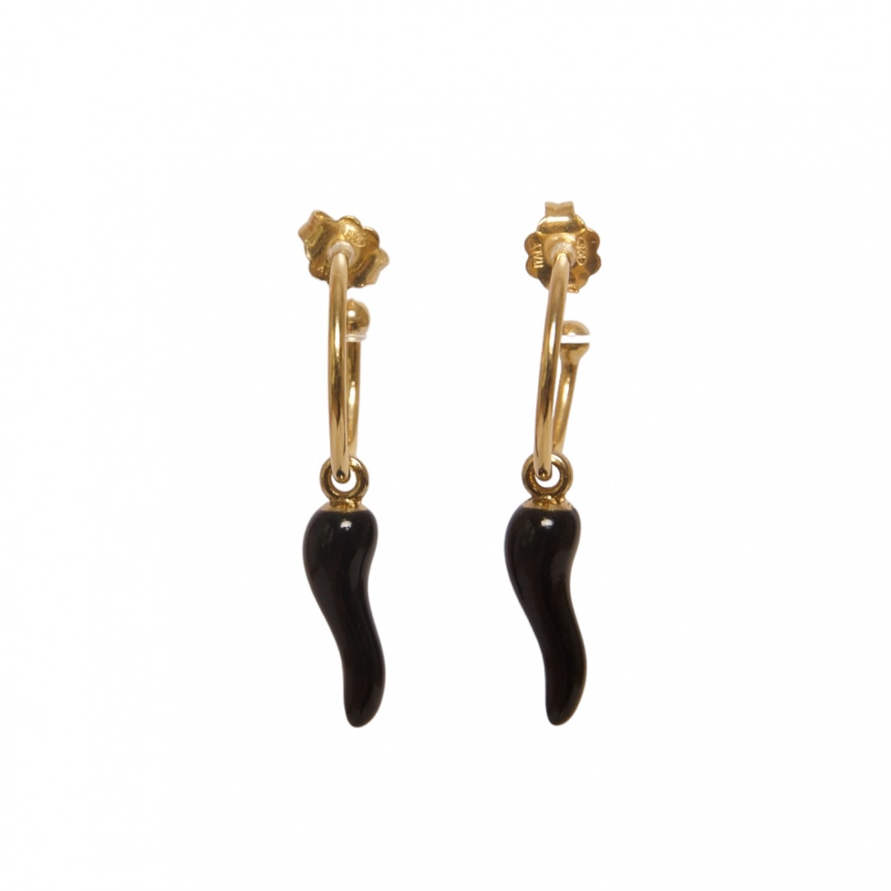 Orecchini a cerchietto aperto in argento dorato con pendente a forma di corno smaltato