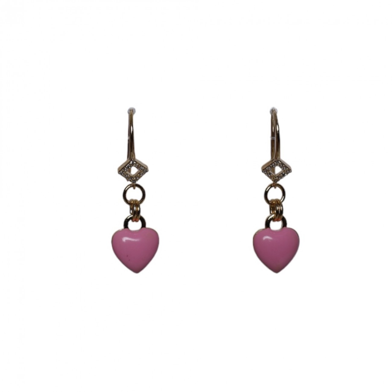 Orecchini con attacco in ottone e strass e pendente a forma di cuore smaltato.
