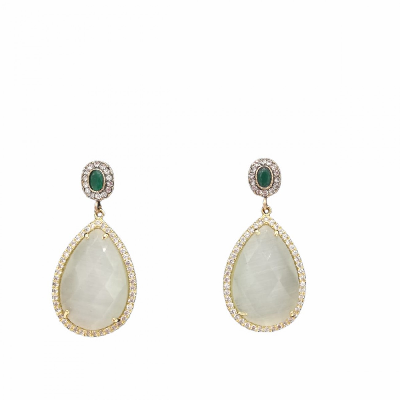 orecchini attacco strass e pietra verde con pendente a goccia in vetro opaco lavorato