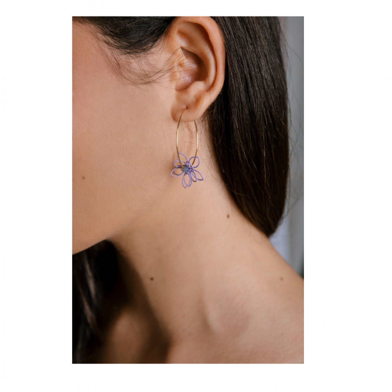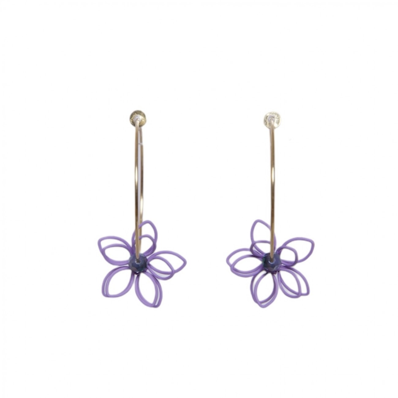 Orecchini a forma di cerchio in argento dorato con pietre sintetiche e charme a in acciaio smaltato a forma di fiore.