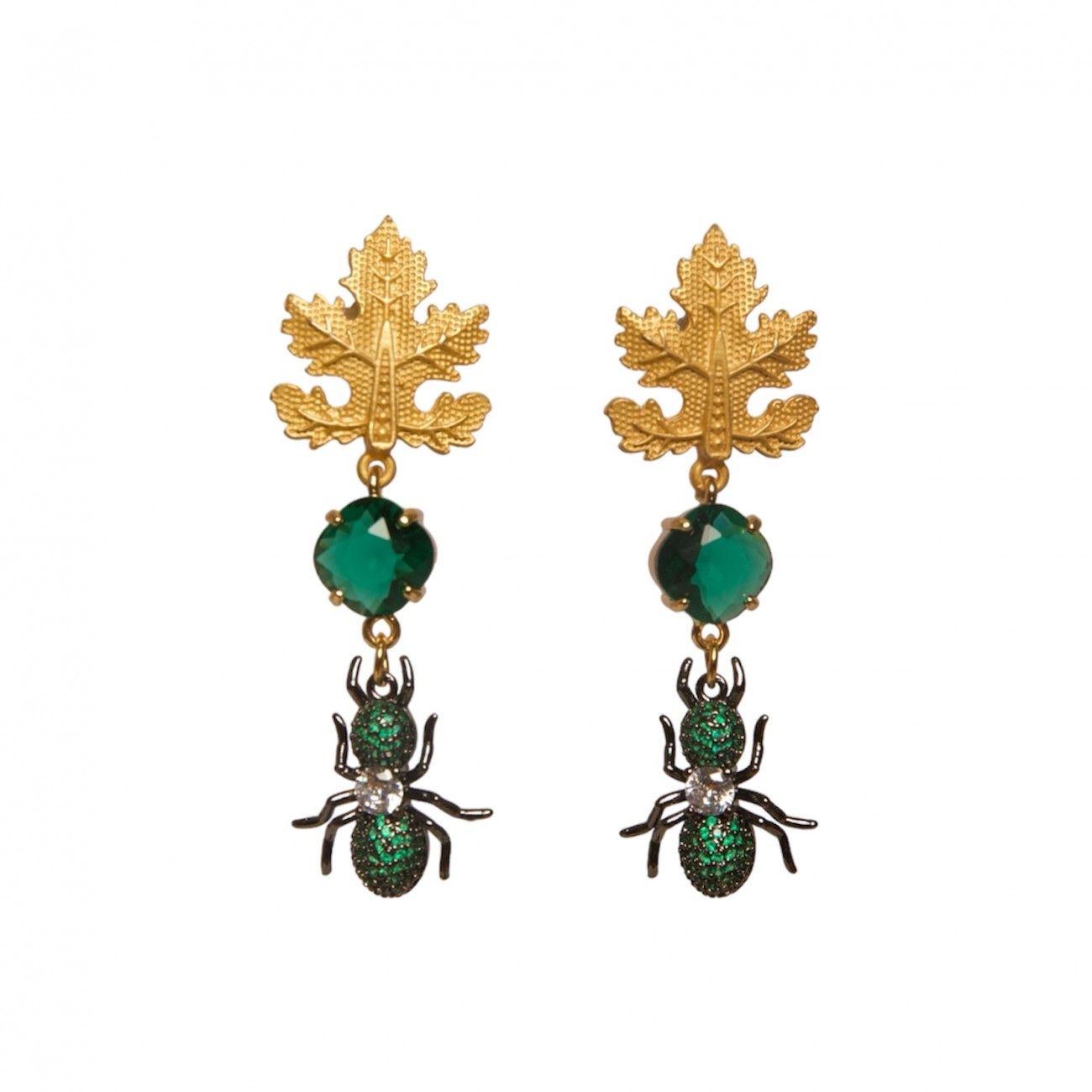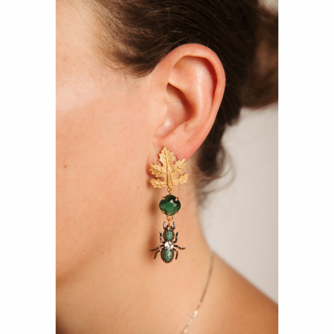 Orecchini con attacco in zama a forma di foglia e pendente con zirconi a forma di formica e cristalli.