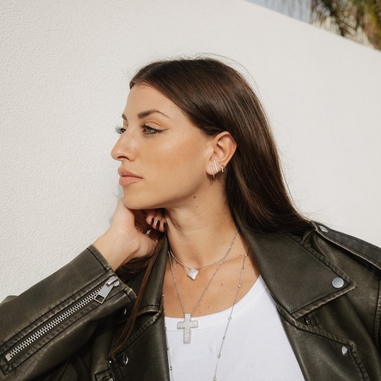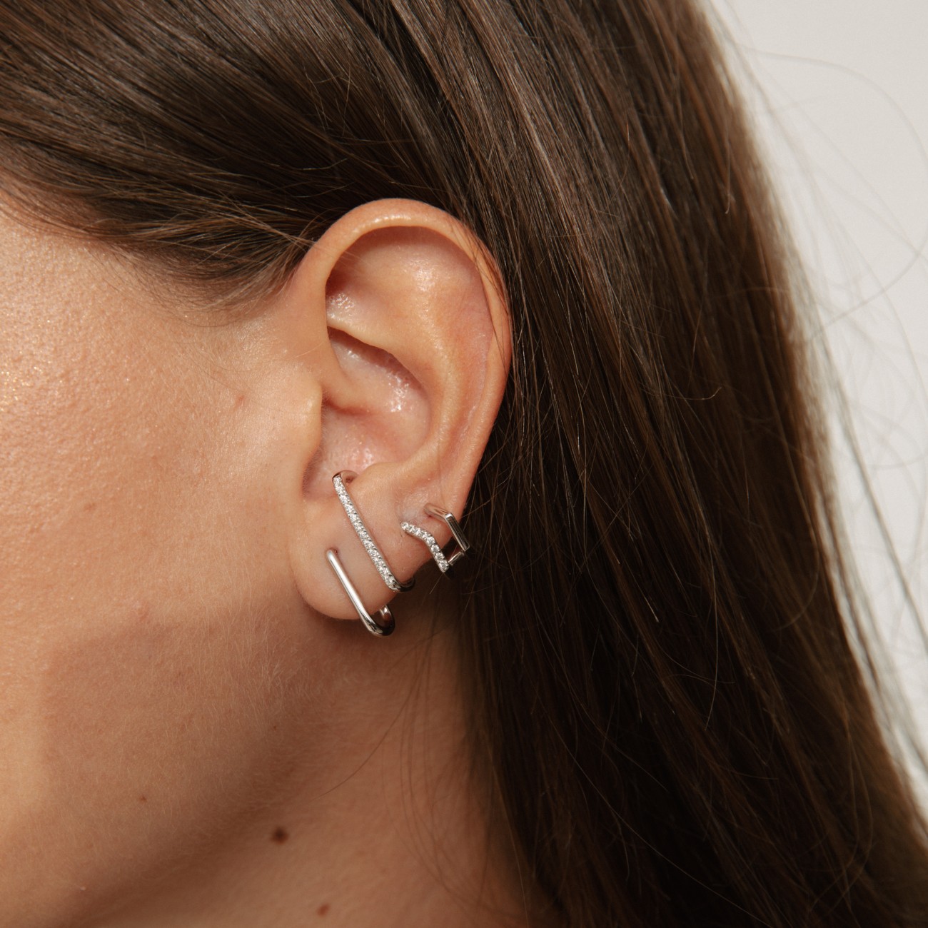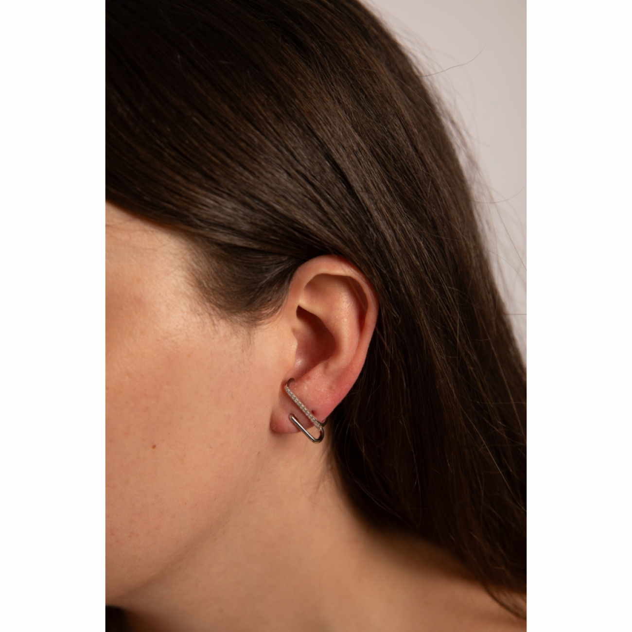Orecchini in argento 925 con strass in moissanite. La forma crea l'illusione di indossare due orecchini distinti.