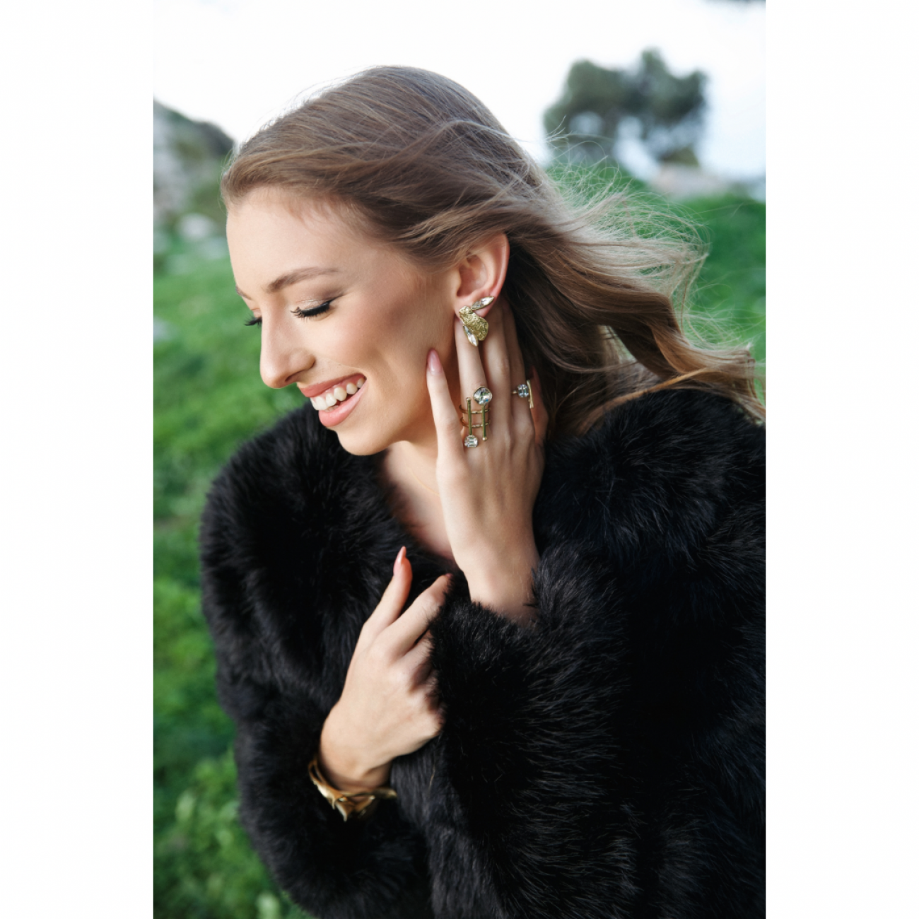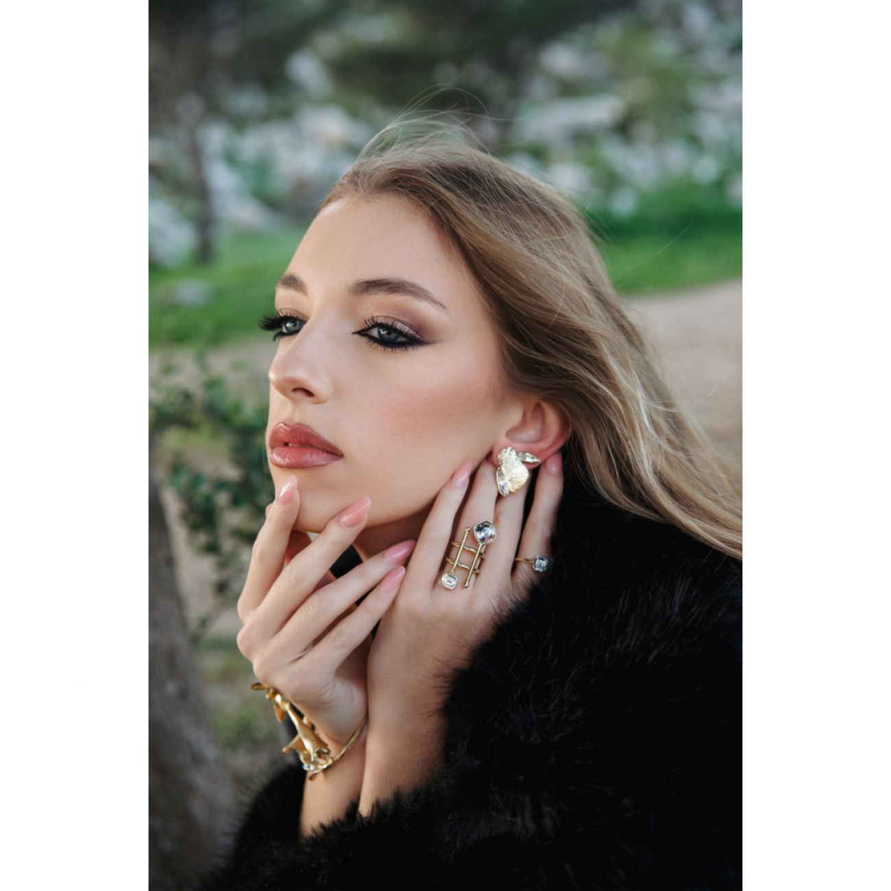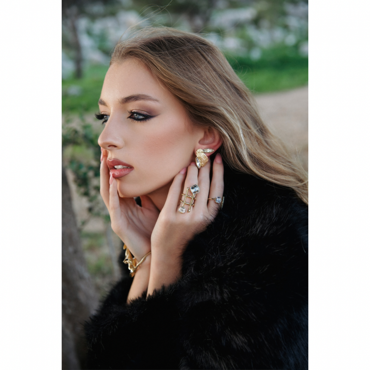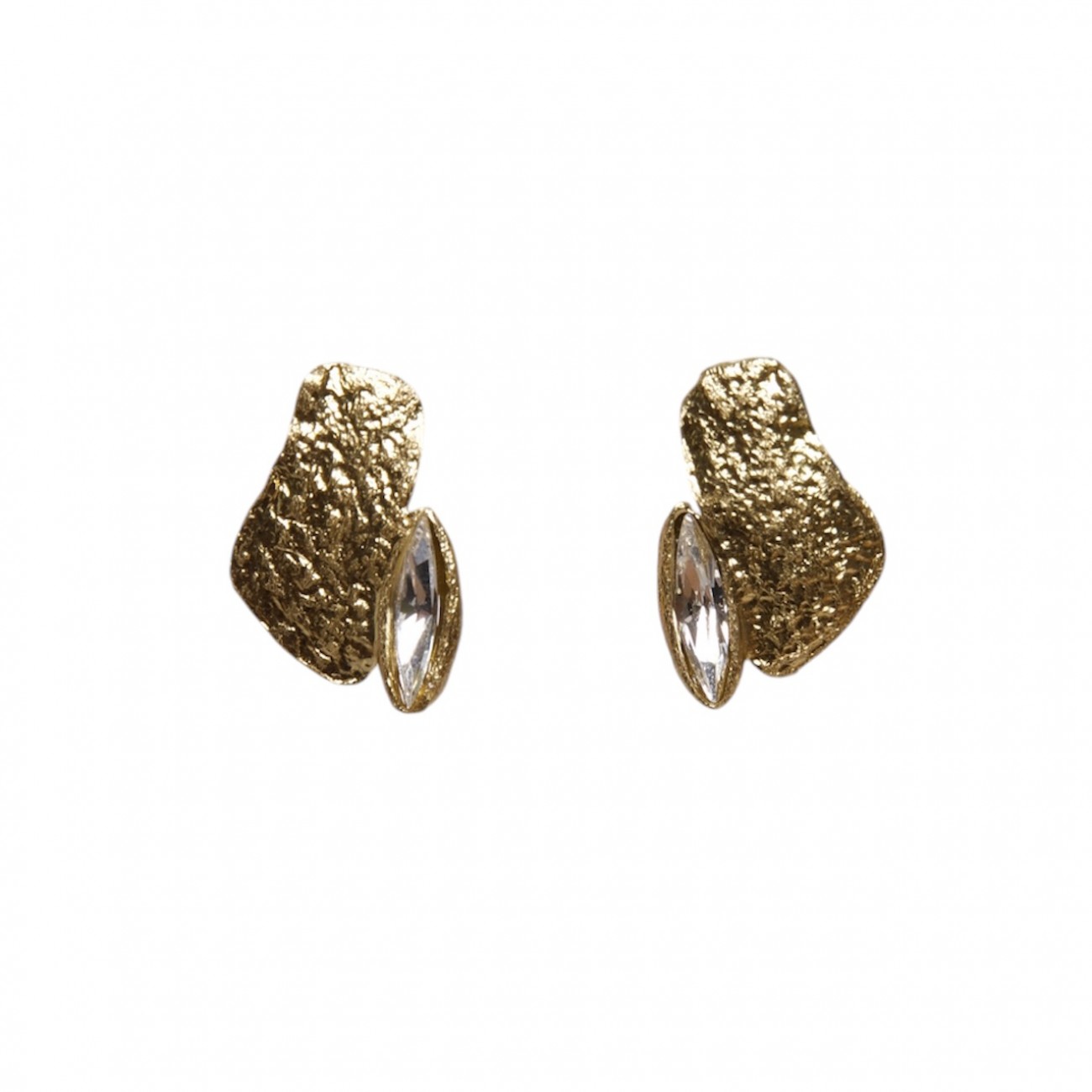 Orecchini in ottone con motivo asimmetrico e incastonatura laterale di pietre sintetiche.