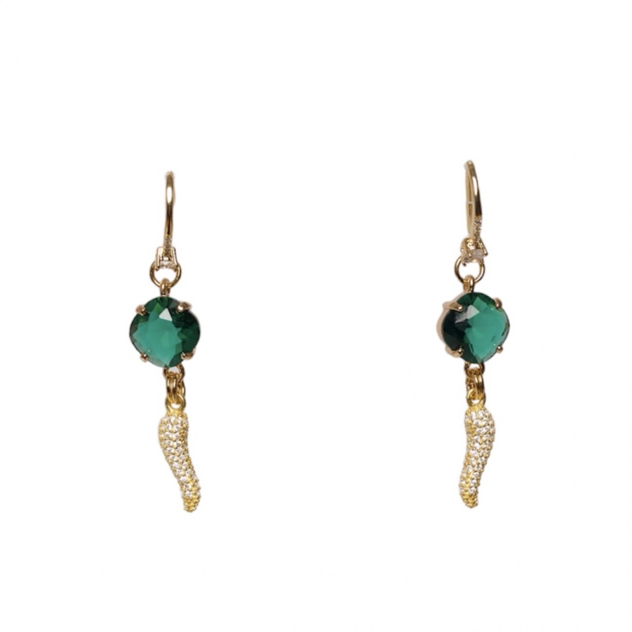 Orecchini in argento dorato con pendente a forma di corno portafortuna e strass