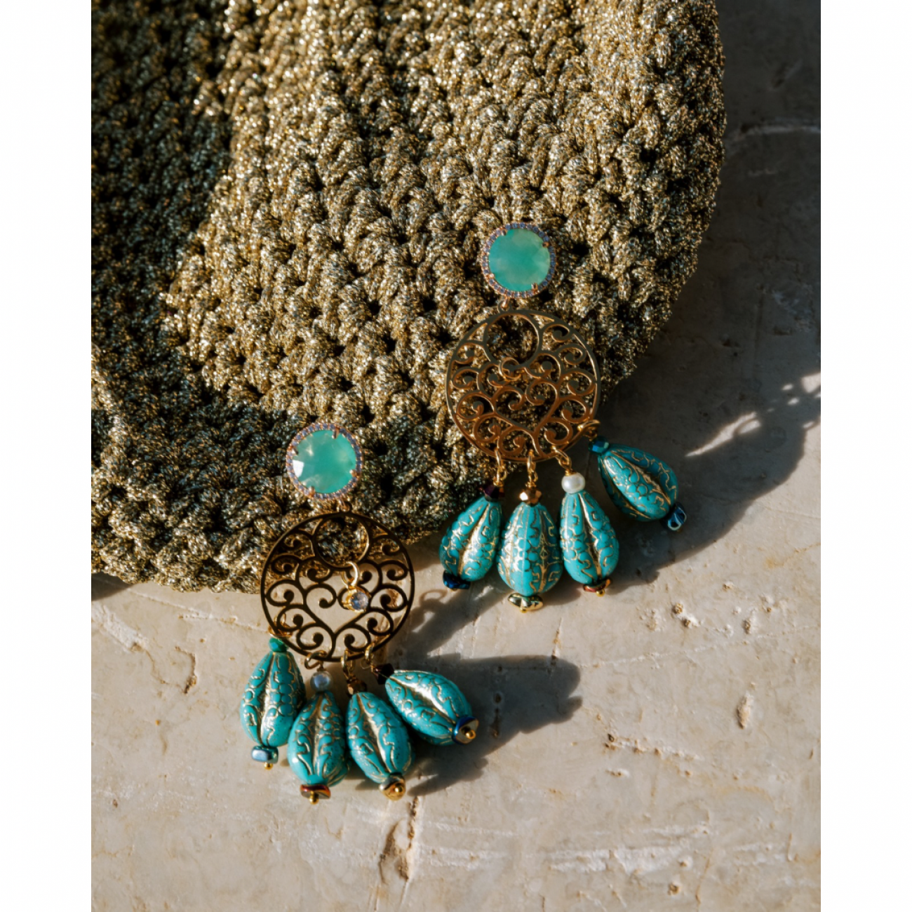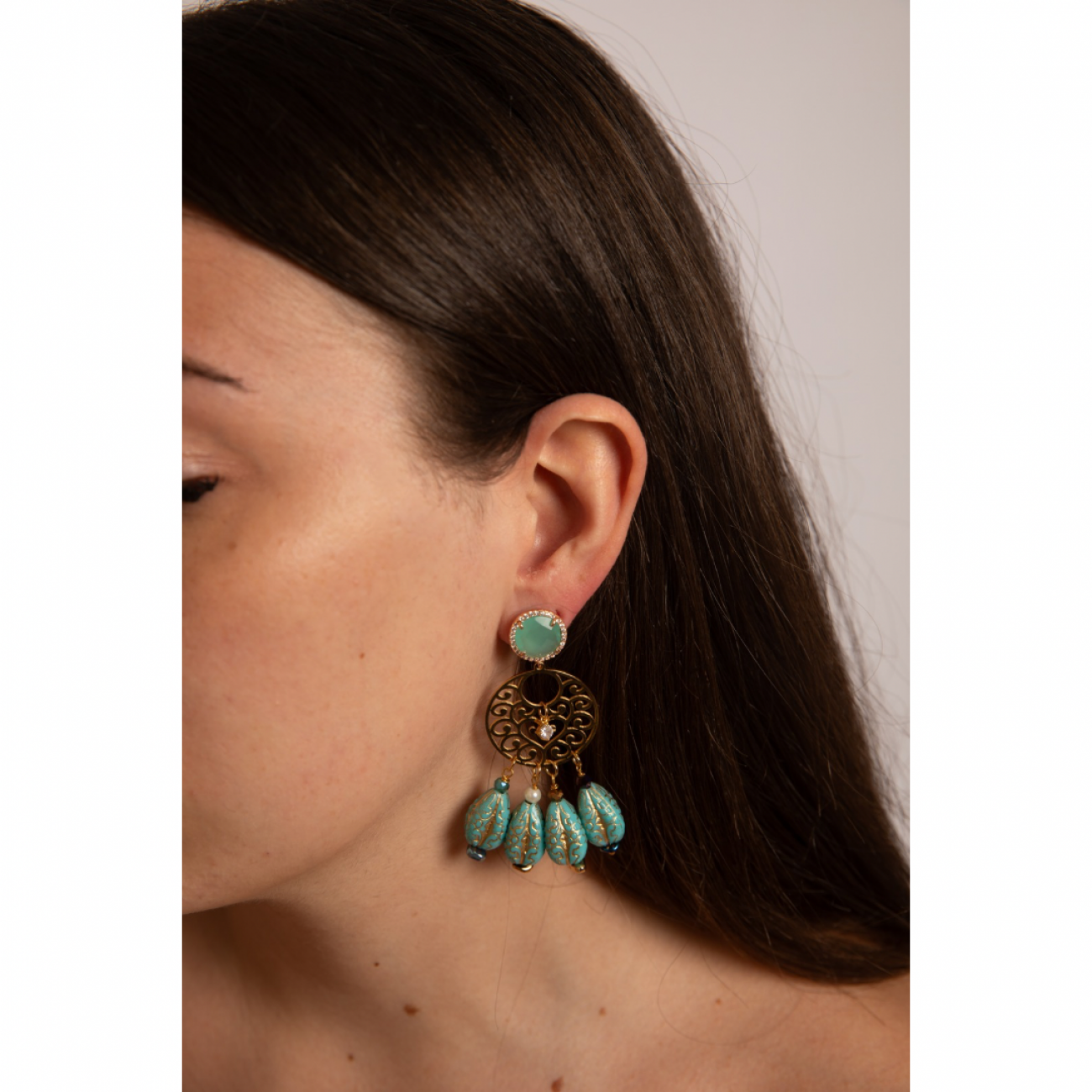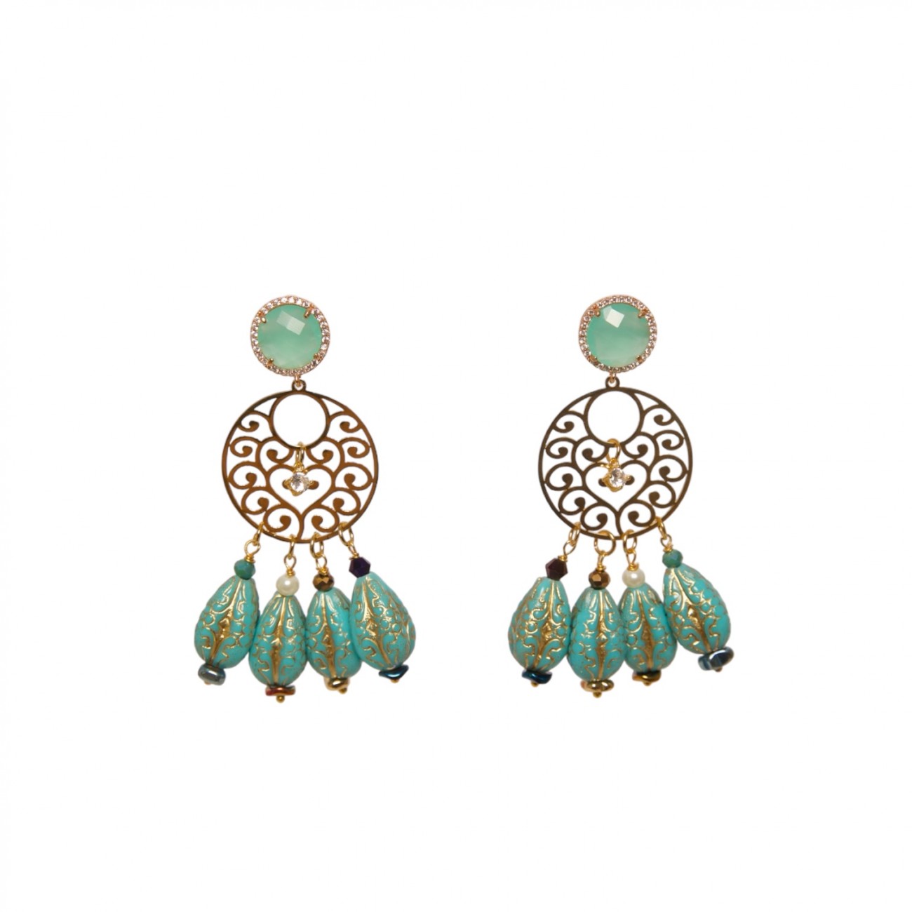 Orecchini con attacco in rame dorato e pietra sintetica con motivo filigrana in acciaio inox e pietre in resina.