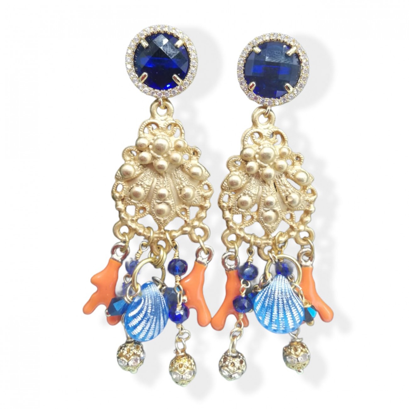 Orechini con attacco in cristallo e strass, zama, perline e coralli smaltati