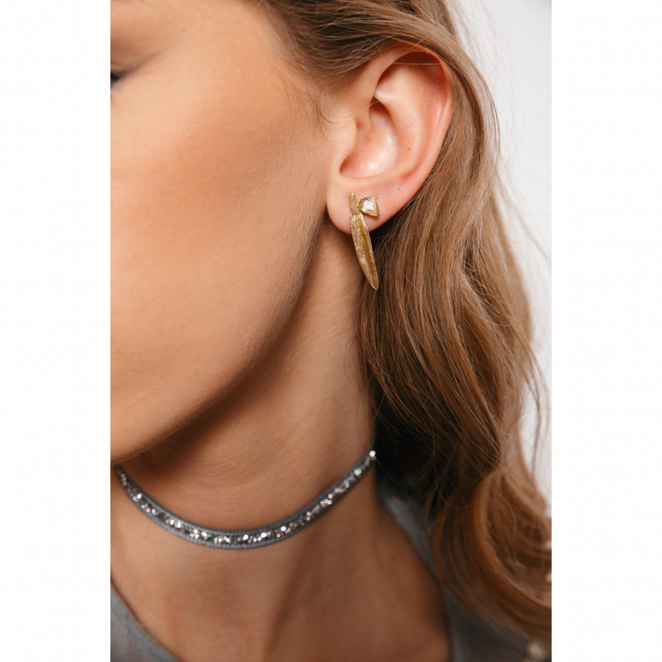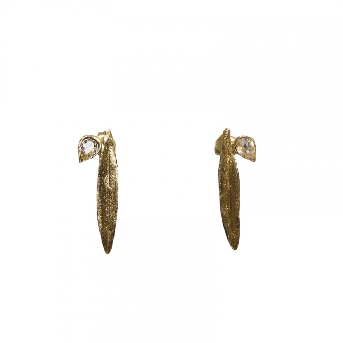 Orecchini in ottone a forma di foglia lunga con cristallo laterale.