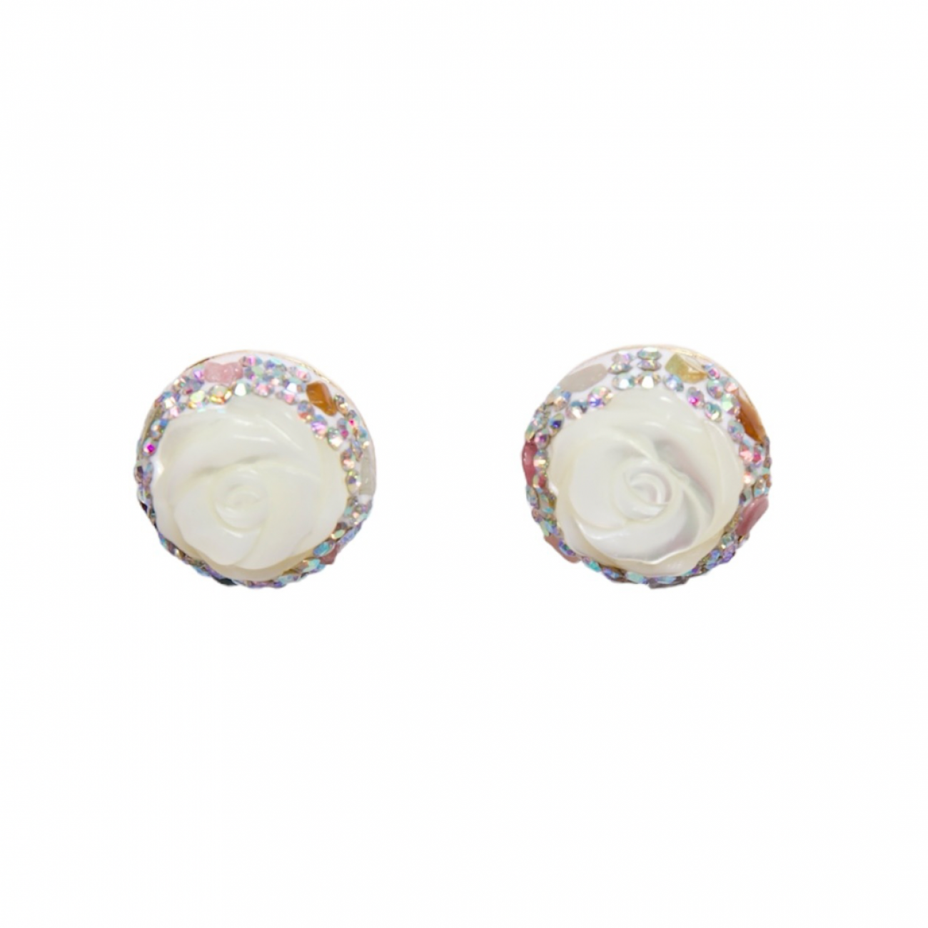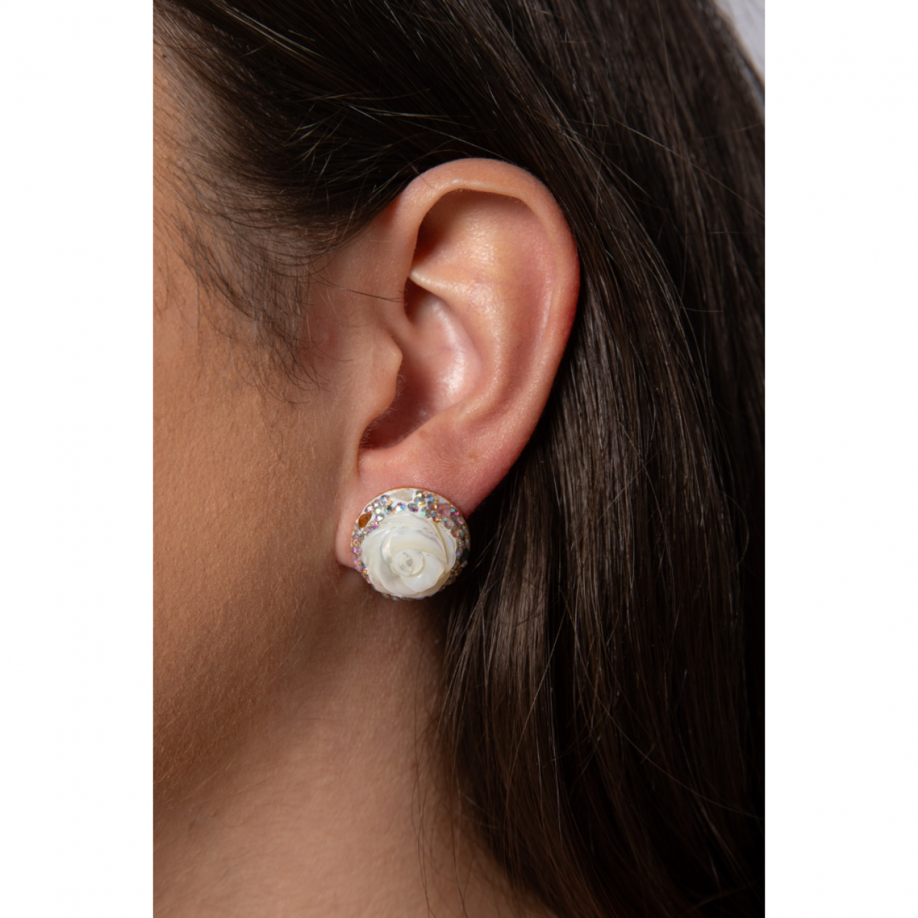 Orecchini in acciaio con motivo in resina a forma di rosa e brillantini sintetici.