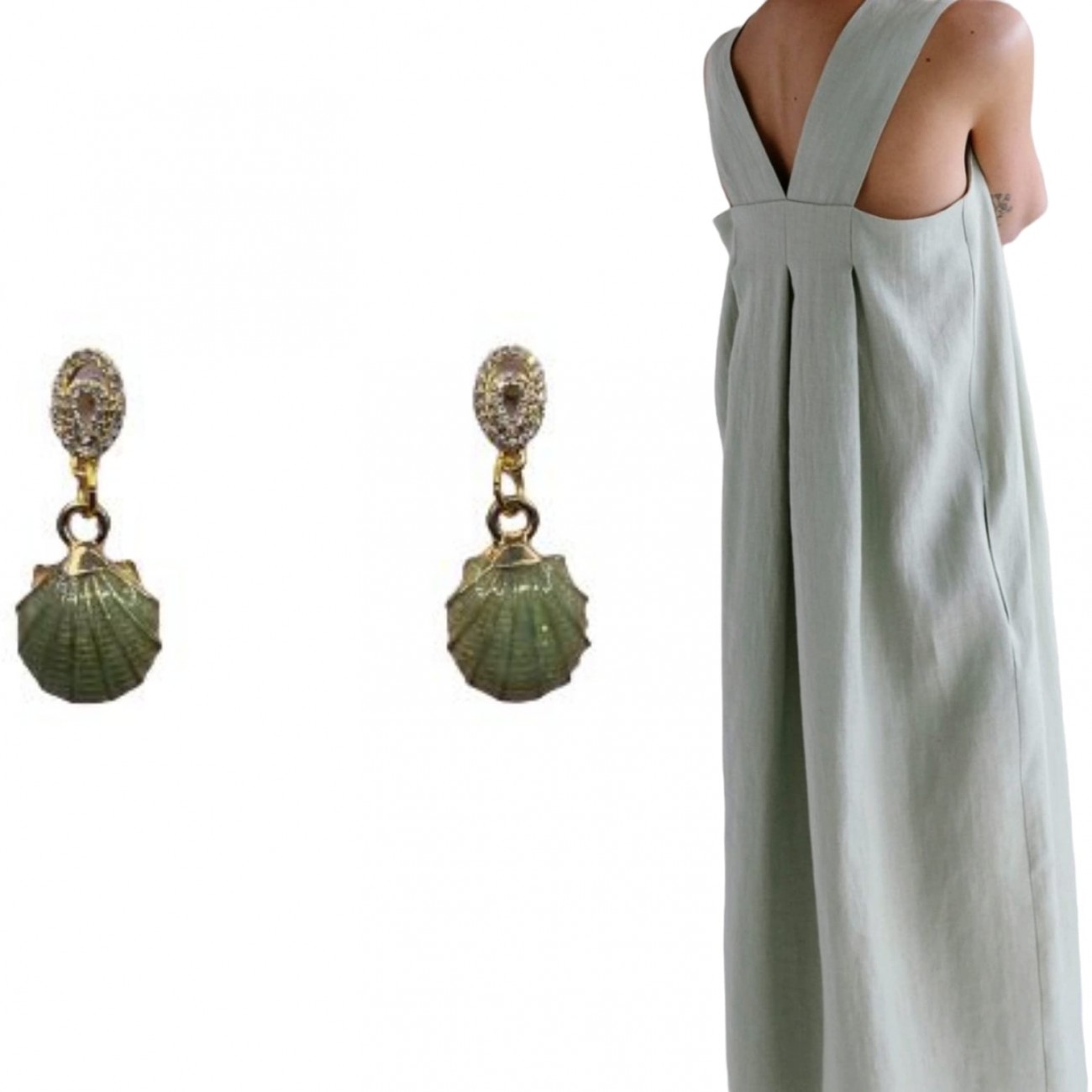 Orecchini con attacco in strass e pendente a forma di conchiglia smaltata.