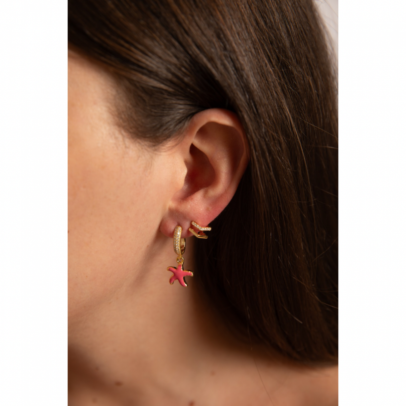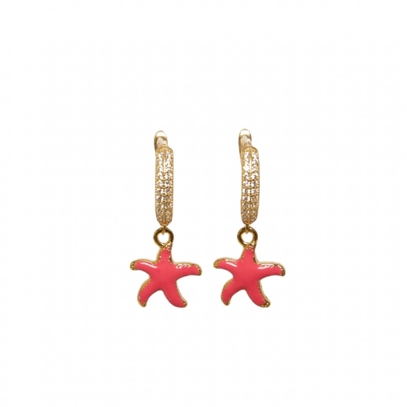 Orecchini con attacco in argento dorato e strass e pendente a forma di stella marina smaltata.