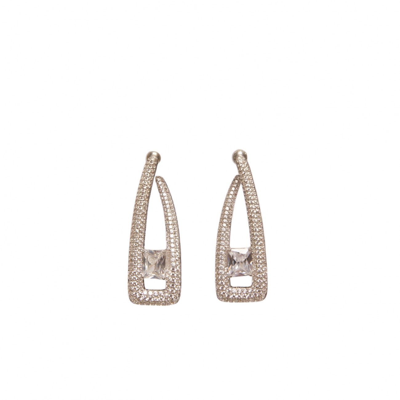 Orecchini in argento con elegante incastonatura piena di strass dalla particolare forma asimmetrica.