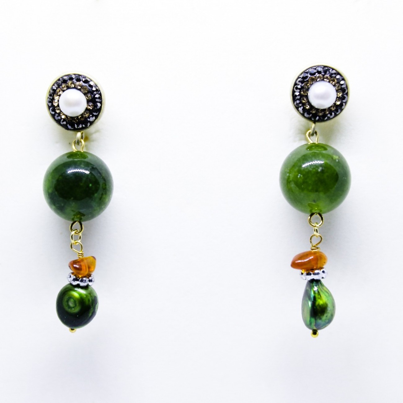 orecchini attacco perla e strass con pietra dura, ambra e perla sintetica